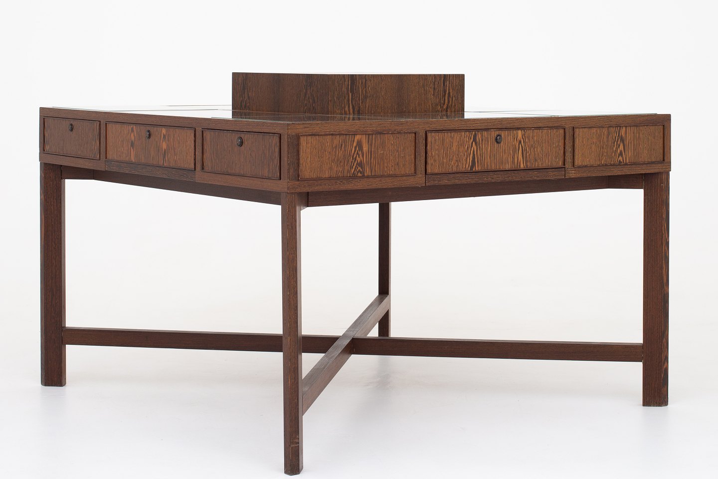 Jewelry disk in wengé made in eight drawer sections w. glass surfaces and blue cotton upholstery, furthermore two extraction plates w. brown leather top. The disk is made for Georg Jensen in the beginning of 1980's.