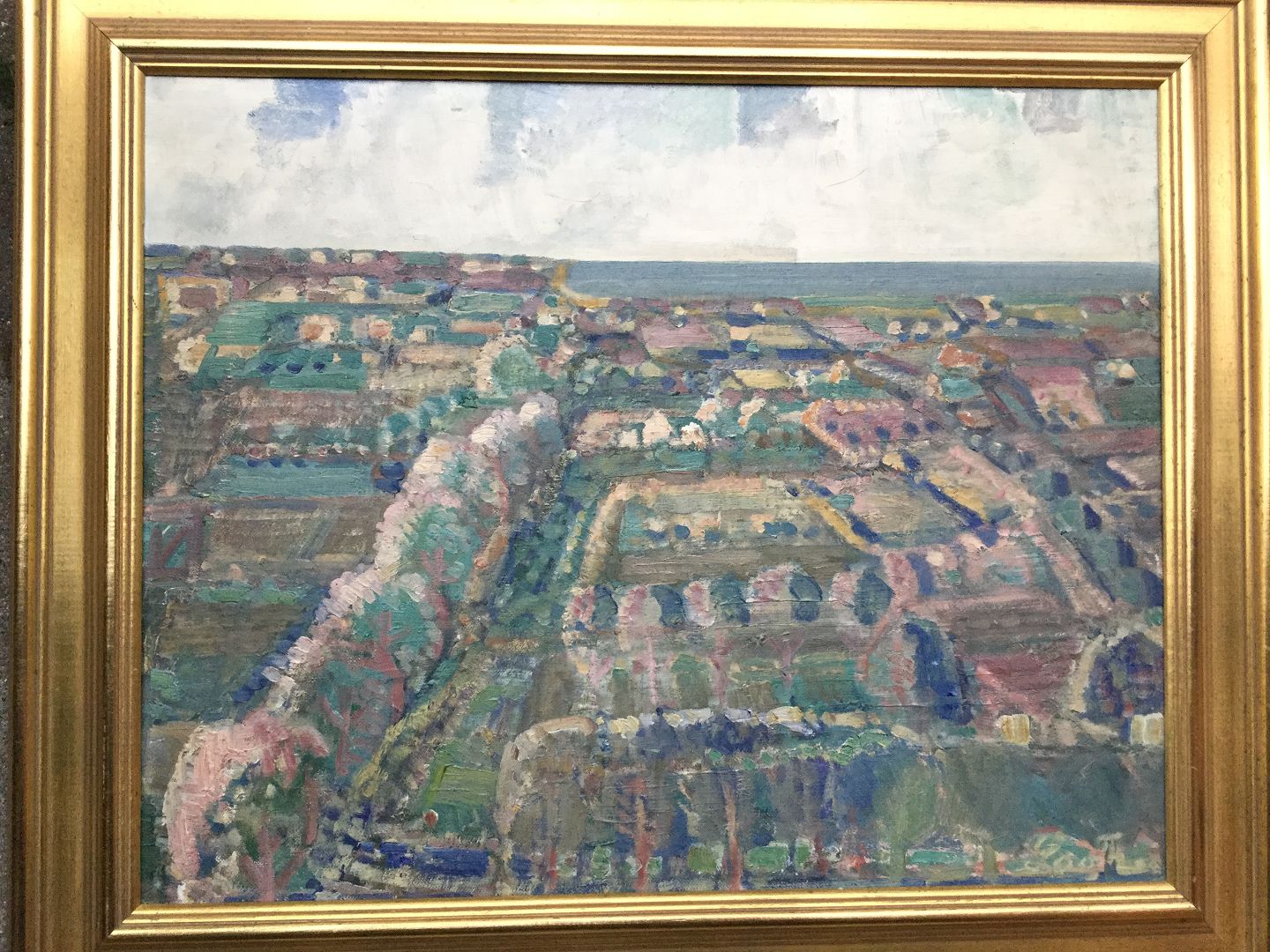 Maleri af Leo Thellefsen - Udsigt ud over by og marker.