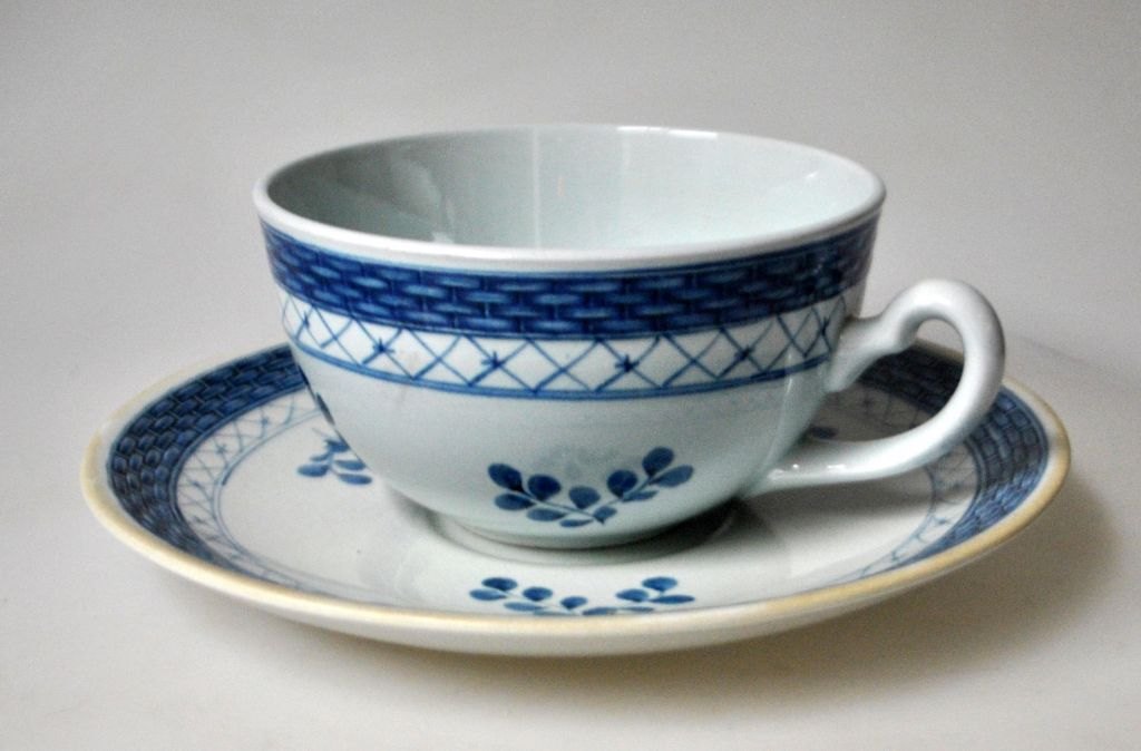 Royal Copenhagen, te kop med underkop, 957, Tranquebar, 20. årh. København, Danmark. Stemplet. Dia. underkop: 16,5 cm. Højde kop: 6 cm. Dia.:  10,4 cm.