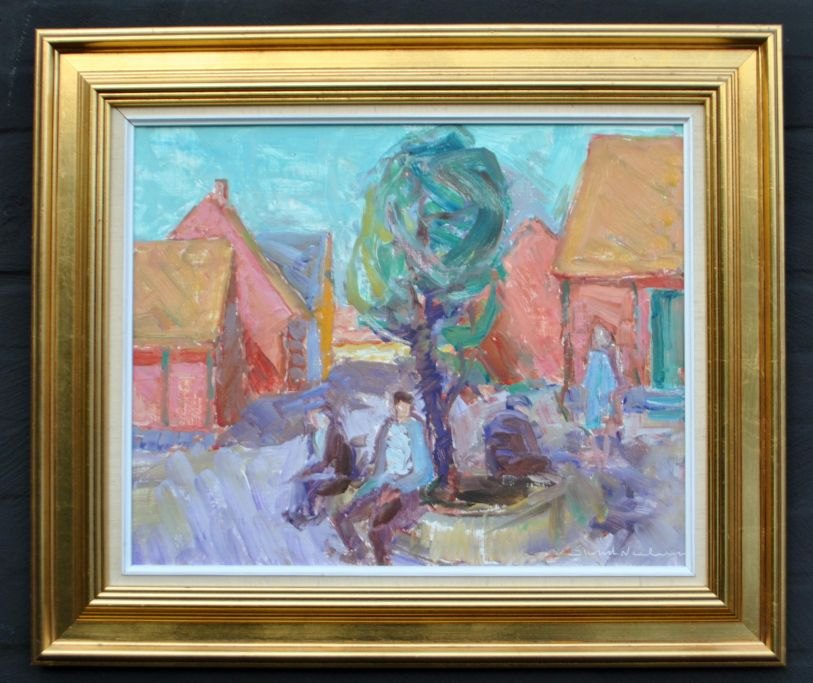 Nielsen, Svend (1908 - 1993) Danmark: Personer på en bænk, Bornholm. Signeret. Olie på lærred. 40 x 50 cm.