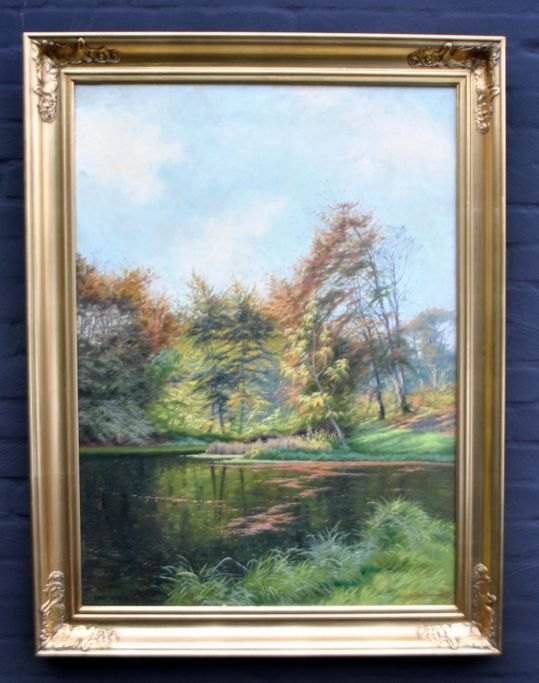 Milton Jensen, Carl (1855 - 1928) Danmark: Skov scene, Marselisborg Skov, Aarhus. Signeret 1895. Olie på lærred. 90 x 65 cm.