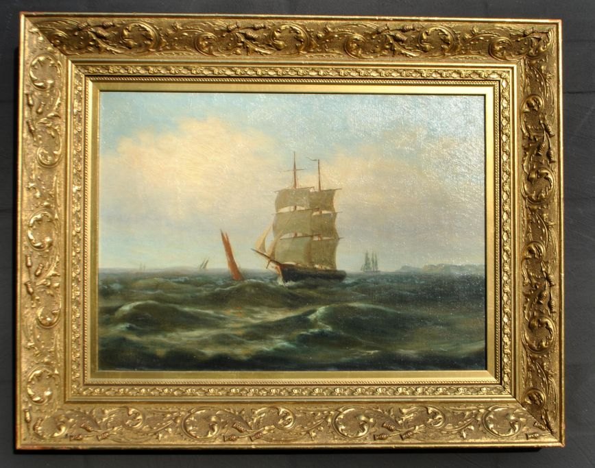 Ubekendt kunstner (20. årh. ): Marine med sejlskibe. Olie på lærred. Signeret.: C. M 07. 34,5 x 48 cm.