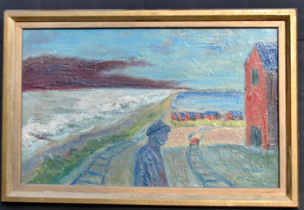 Bailum, Henry (1917 - 1985) Danmark: Høftearbejder - Bovbjerg. Olie på plade. Signeret.: Henry Bailum 1963. 38 x 62 cm.