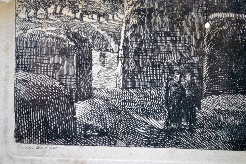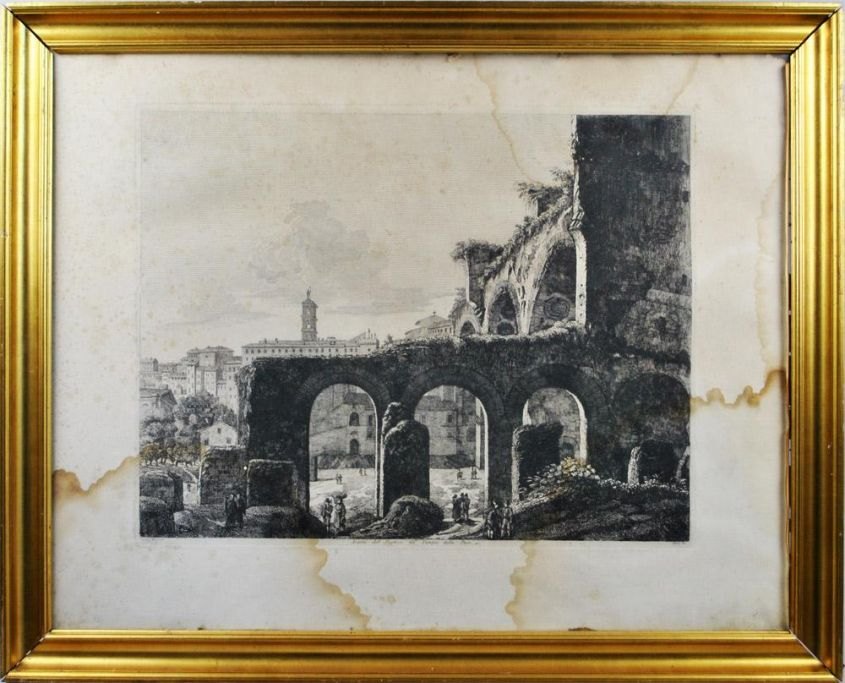 Rossini, Luigi (1790 - 1857) Italien: Avanzi del Portico del Tempio della Pace. Kobberstik. Signeret Roma 1821. 36 x 46 cm.