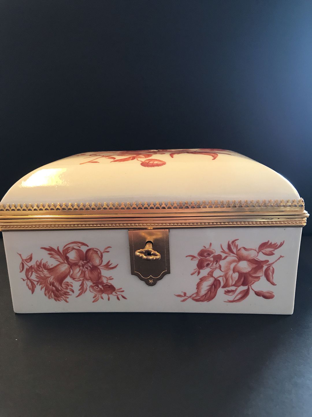 Stort teskrin eller sukkerskrin fra Royal Copenhagen. Forgyldt montering og nøgle. Blomster motiv på alle sider.