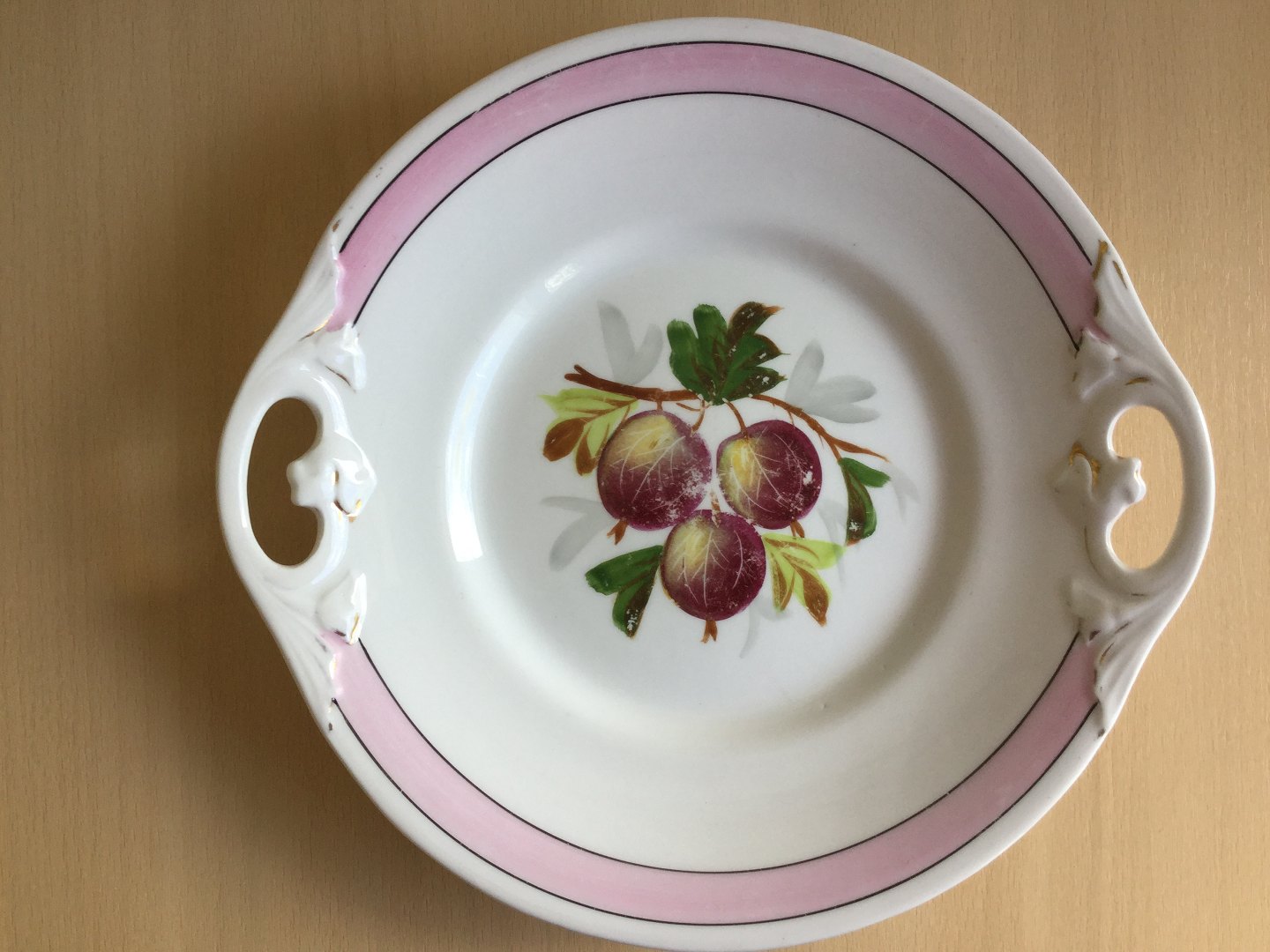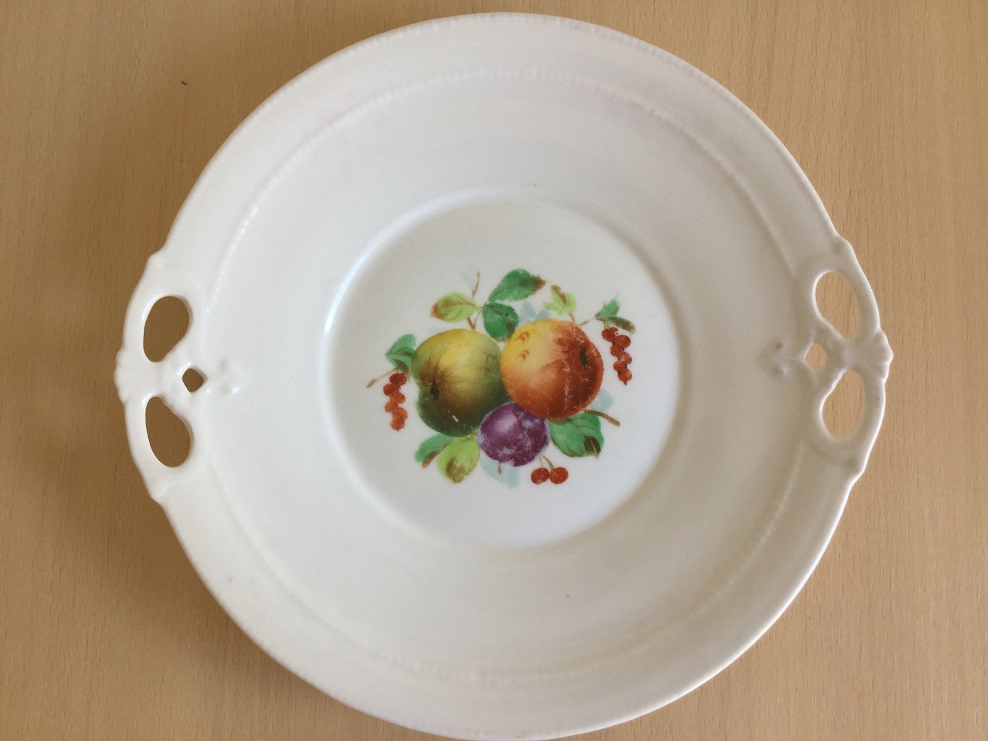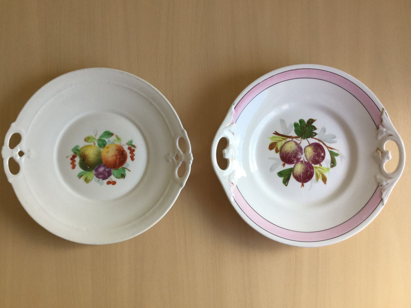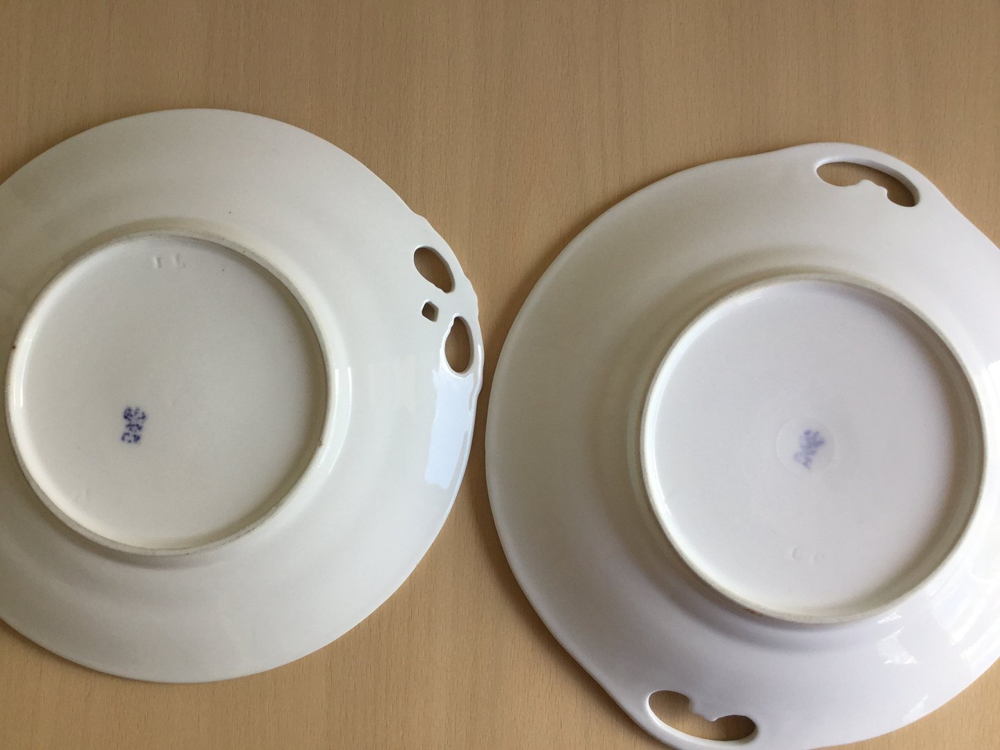 Text available in Danish: 2 antikke CT porcelænsfade med gennembr. hanke.