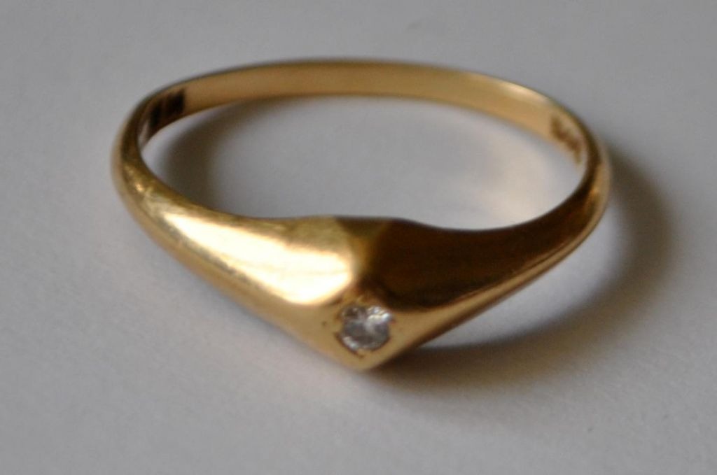 14 karat guld ring med brillant, 20. årh. Danmark. Stemplet: SH. Størrelse: 52. Vægt: 1,4 gram. Brillant slebet, 1/16 karat.