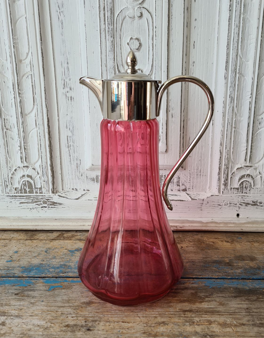 Smuk vinkande i hindbærfarvet glas med forsølvet montering.
