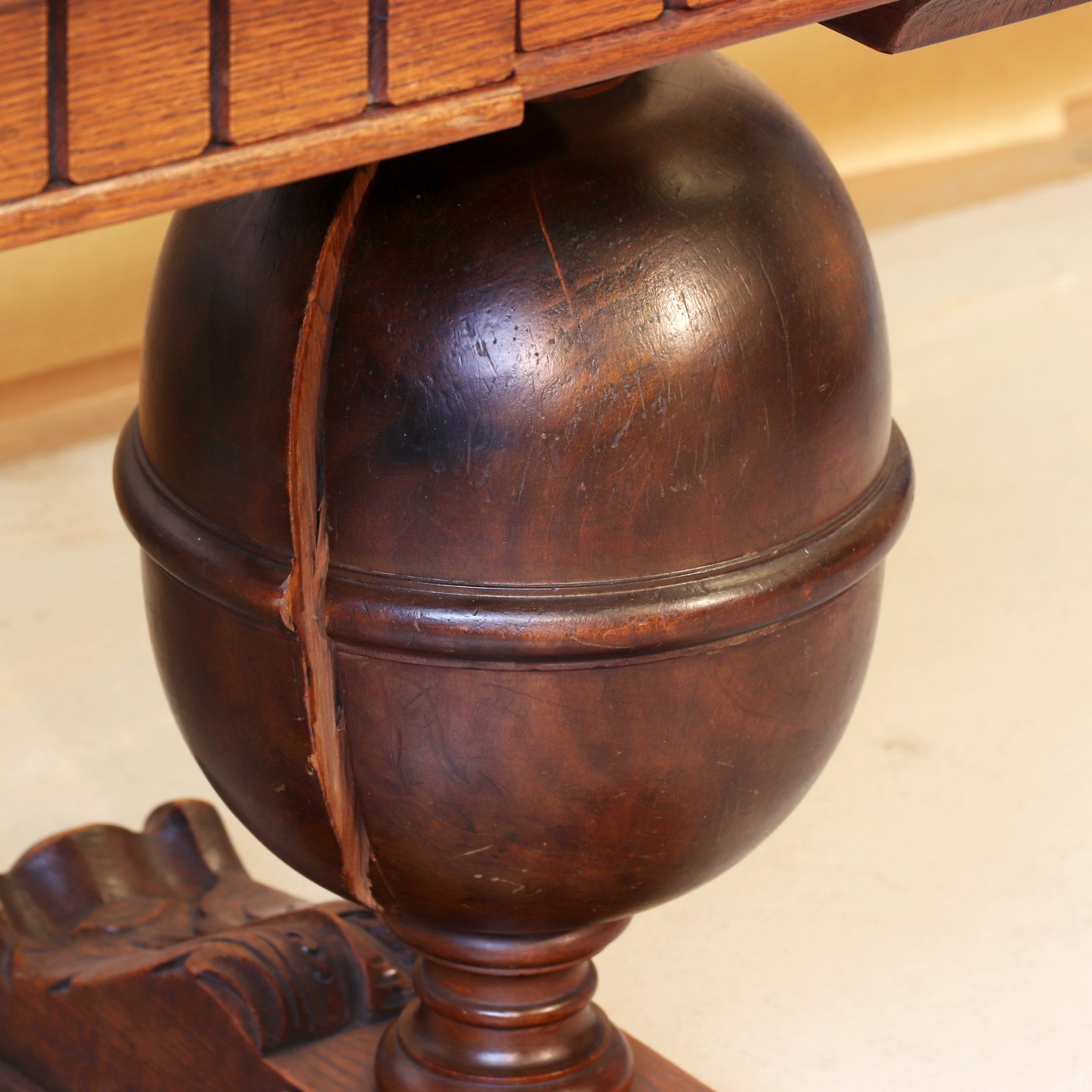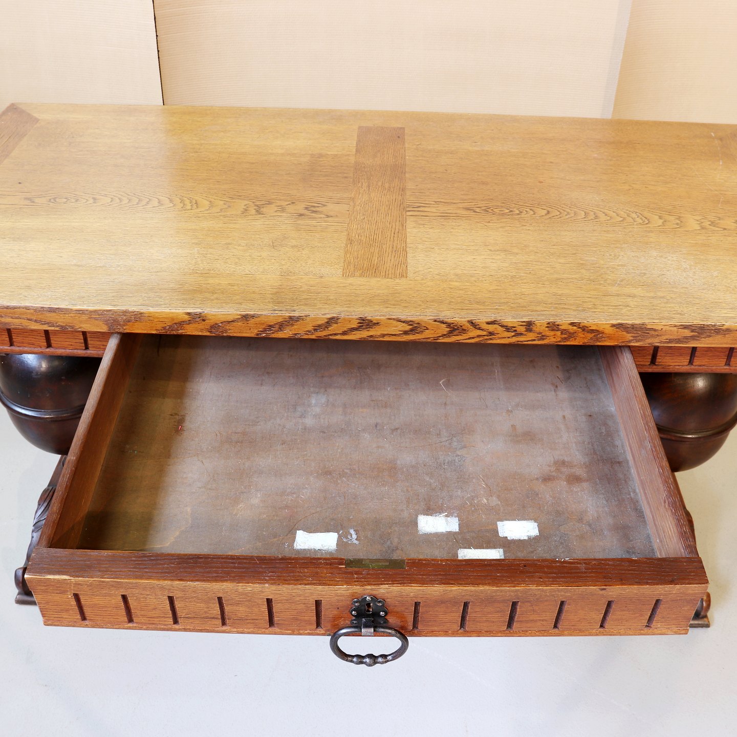 Skrivebord i bejdset, fineret og lakeret egetræ m. skuffe, i renæssancestil,
