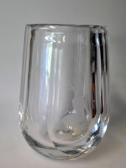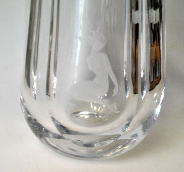 Octagon formet vase i klart glas, Orrefors, Sverige, 20. årh. Design: Sven Palmqvist. Slebet dekoration af nøgen kvinde. Signeret.: Orrefors P 3126. : 17,5 cm.
