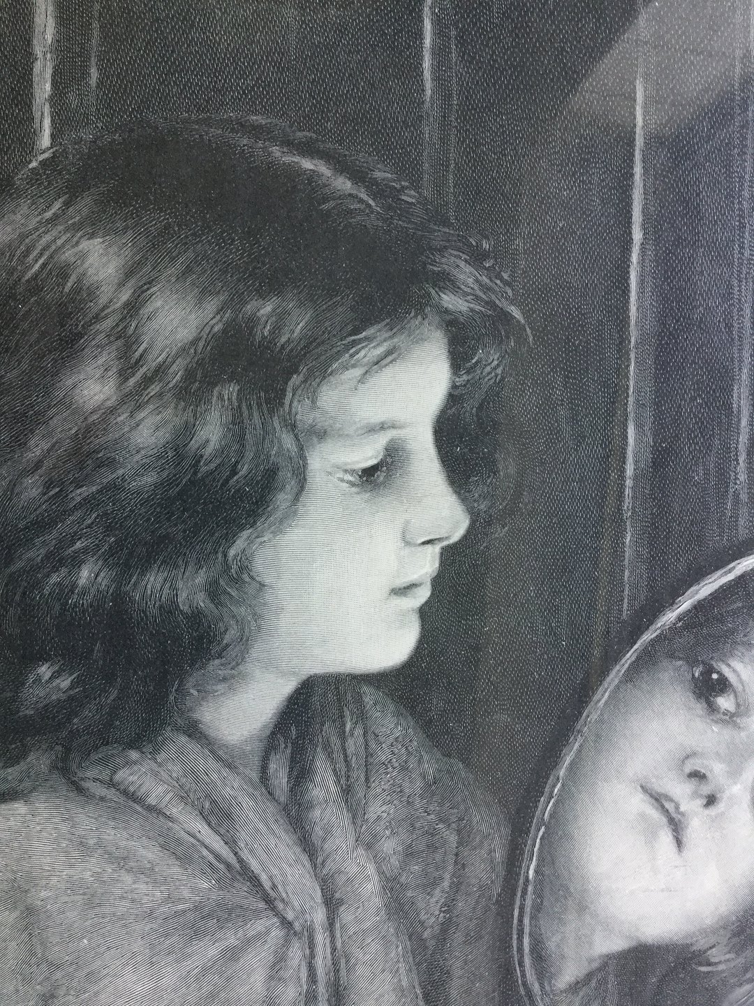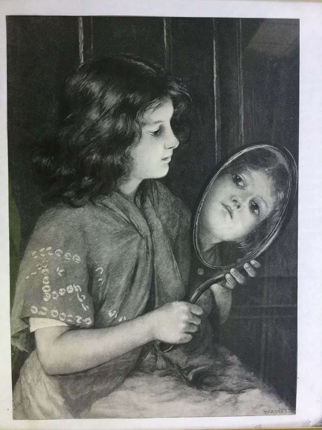 Træsnit af H. Gedan - Pige der spejler sig - 1900.