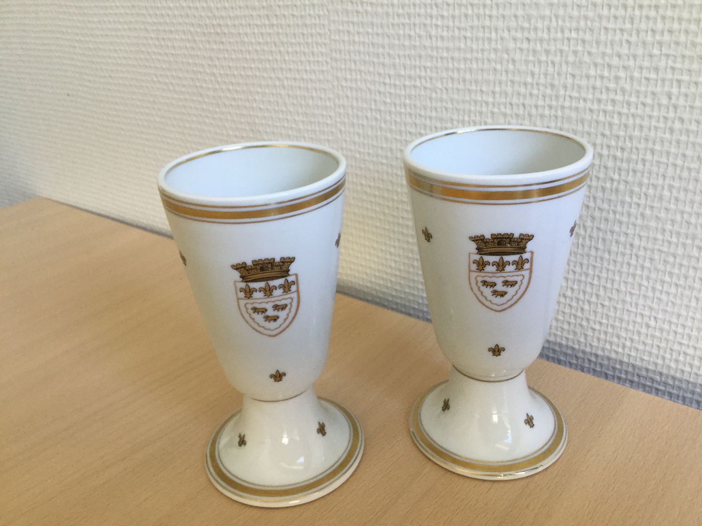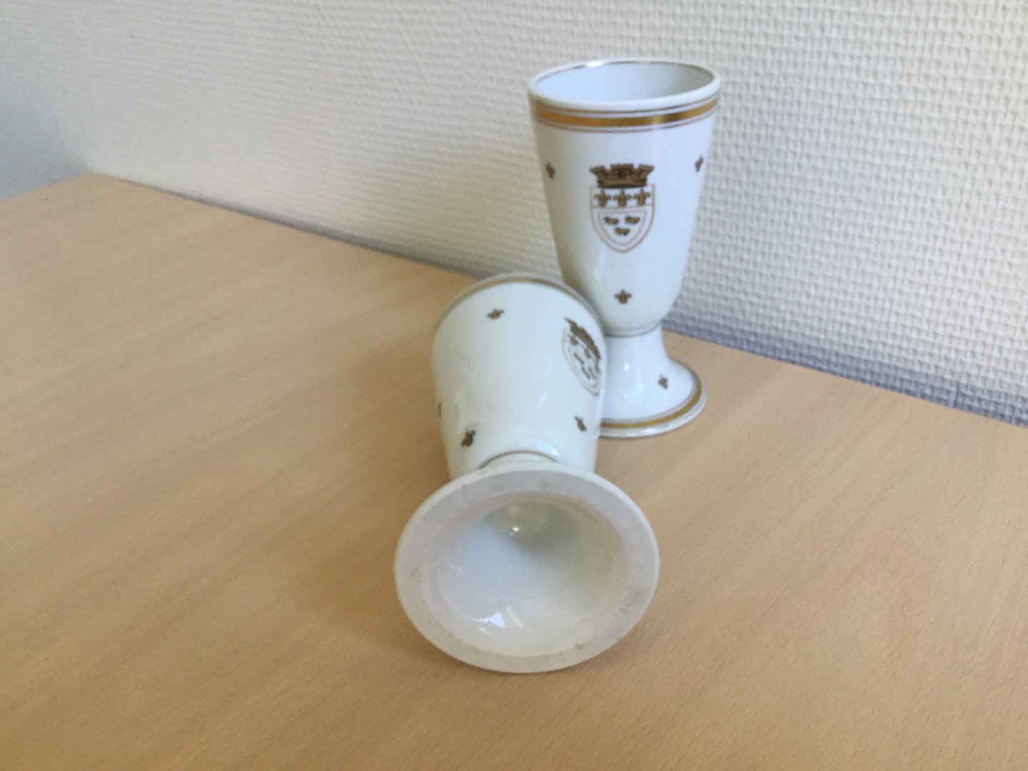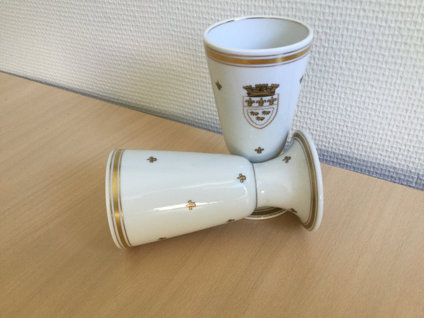 Porcelæn dekoreret med guld våbenskjold og guld franske liljer.