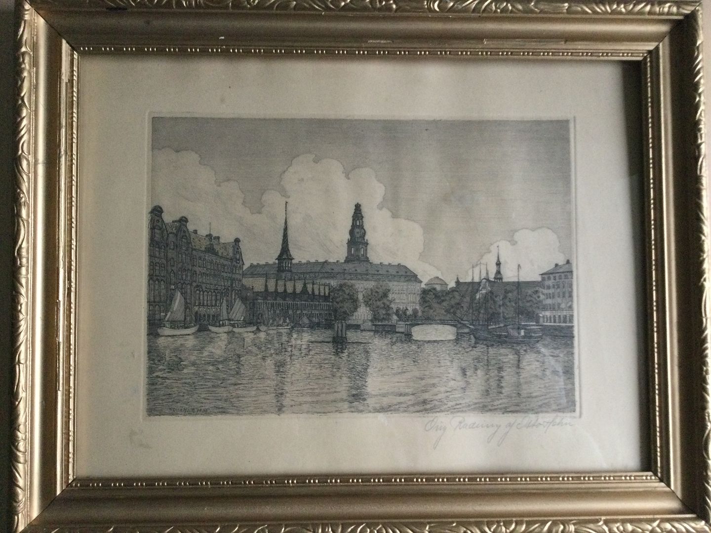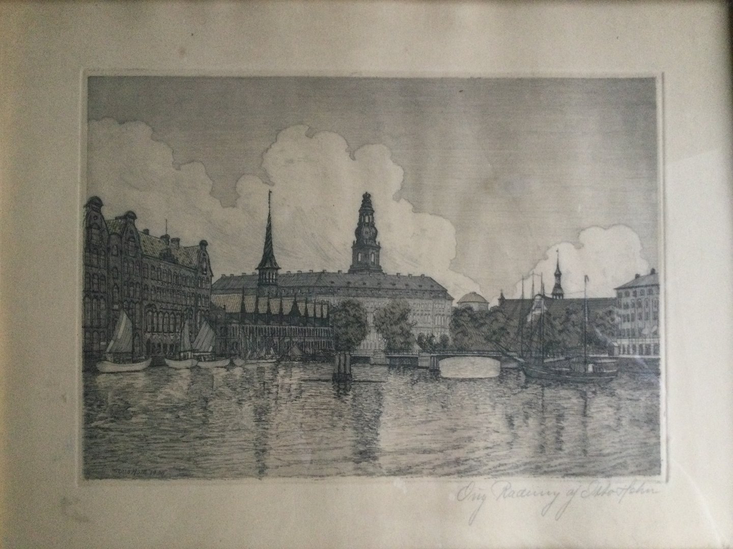 Text available in Danish: Radering af Otto Holm - Christiansborg Slot og Børsen i København 1930.