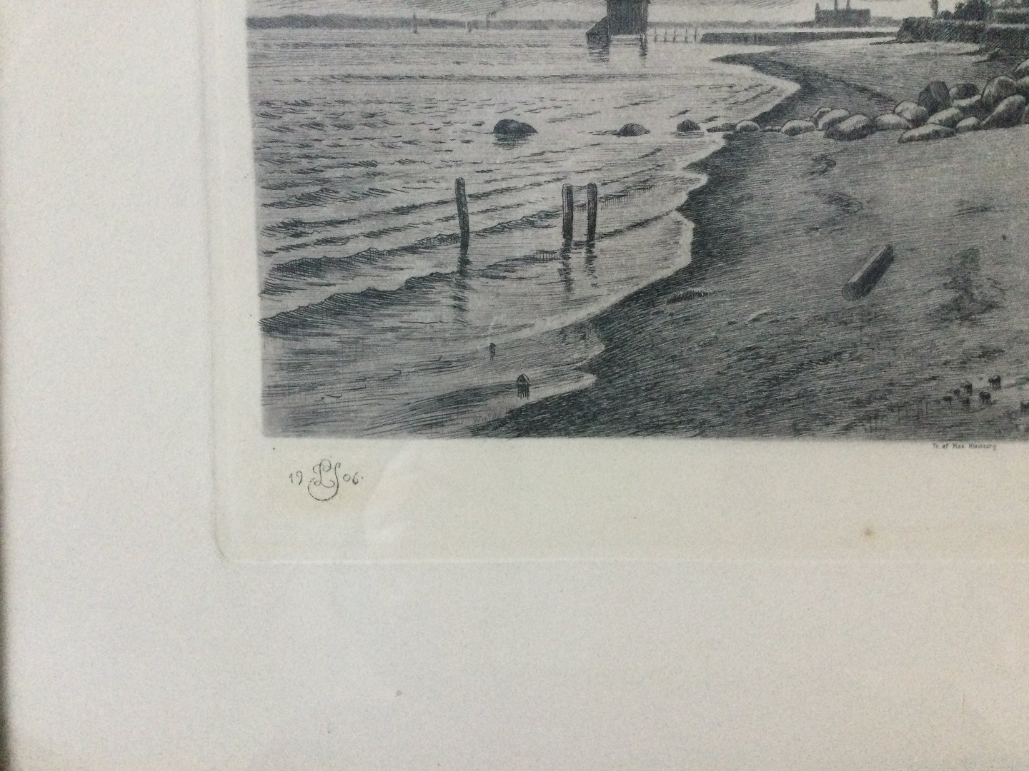 Radering af Louis Jensen 1906 - Strandparti Hellebæk med Kronborg Slot i baggrunden.
