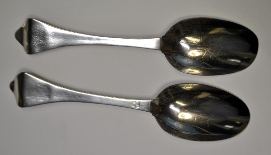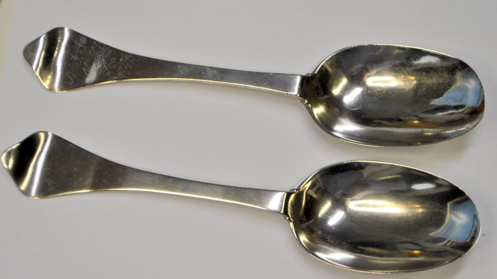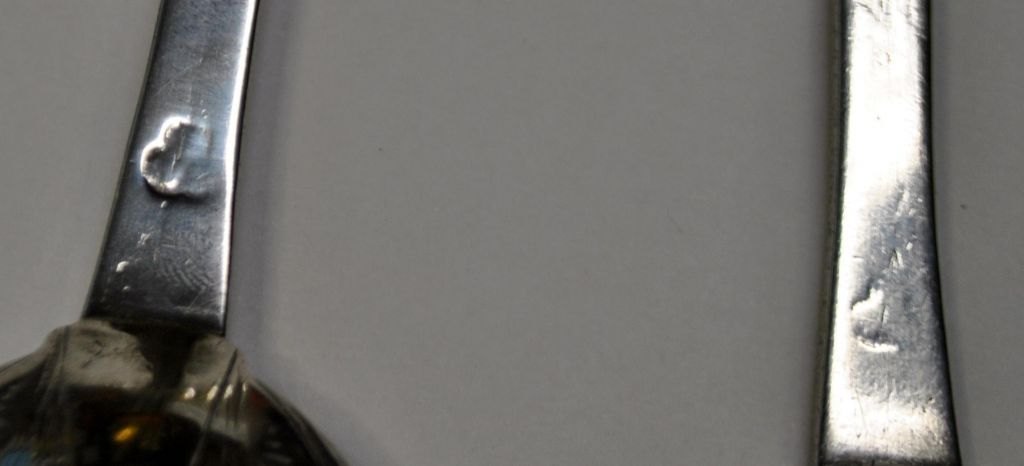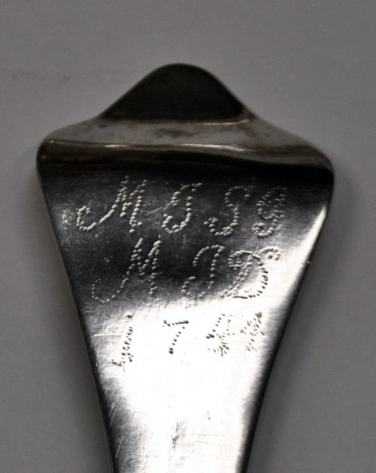 Et par rottehale skeer. Dansk sølv smed 1744. Med rottehale og kartusche i form af bladværk. Foran indgravering fra 1840, bagpå: M.J.S.J / M.J.S 1744. Utydelige stemplet af den samme mester. Længde.: 19 cm.