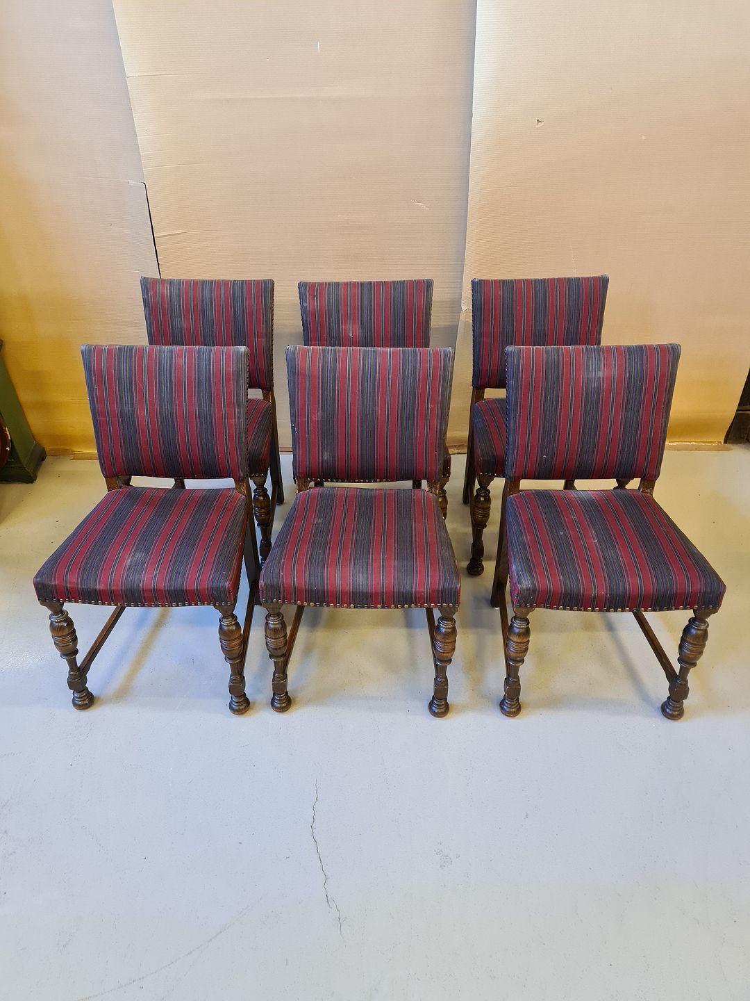 6 Stole i egetræ fra 1930erne , betrækket er noget nusset.