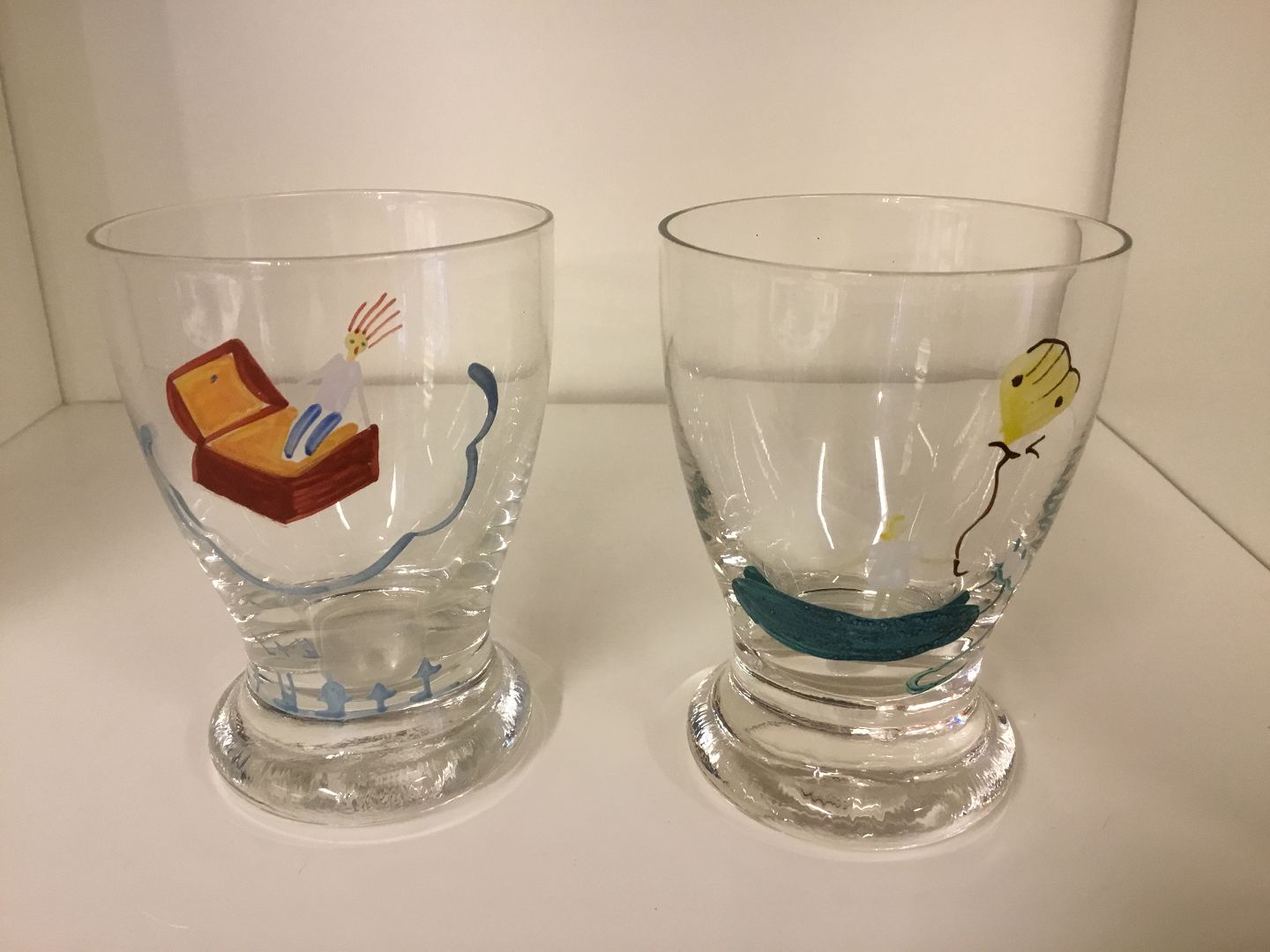 Holmegaard Glasværk, Børneglas med emaljemalet med motiver fra H.C.Andersens eventyr. Design: Jacob E. Bang i 1937, "Den flyvende kuffert" og "Tommelise" Højde 9 cm, Diameter 6,5 cm