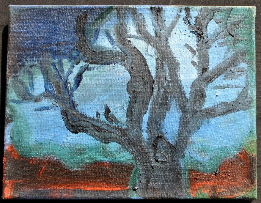 Kühl, Lena (1950 -) Danmark: Landskab med træ. Acryl på lærred. Verso signeret 2017. 28 x 36 cm.  Uindrammet.