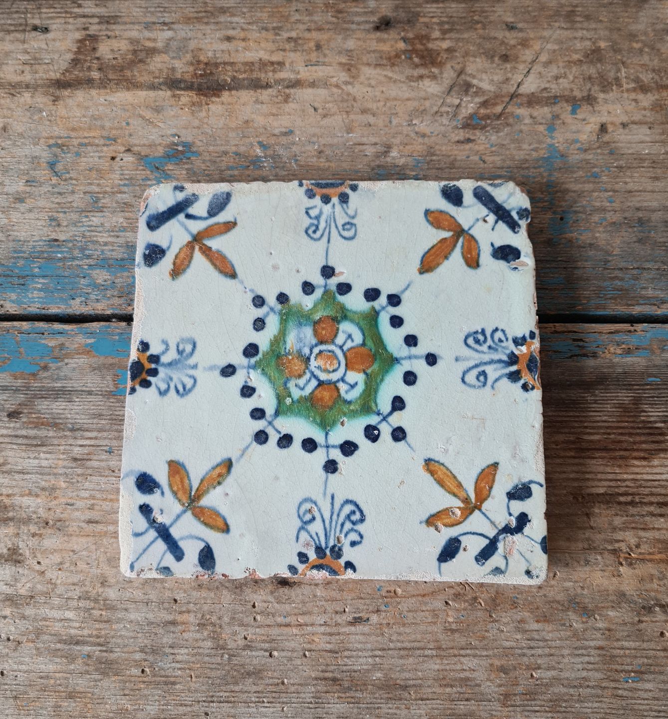 Polykromdekoreret hollandsk flise med blomstermotiv 1600tallet