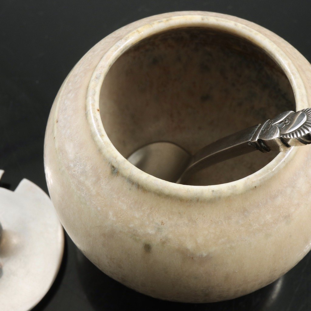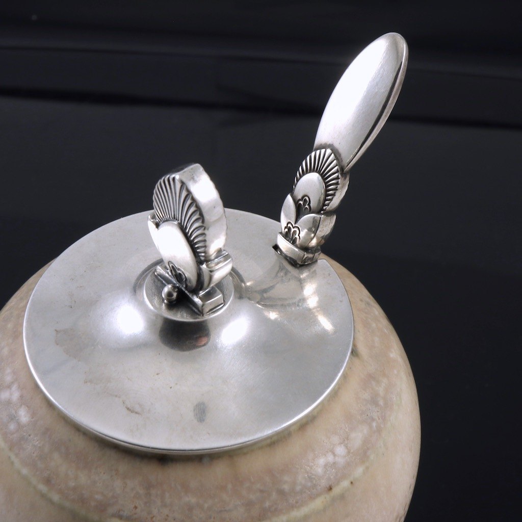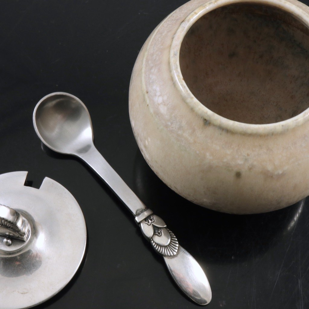 Saxbo - Georg Jensen. Krukke i stentøj med 'Kaktus' låg og ske i sterlingsølv.