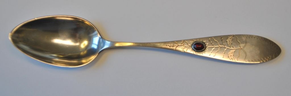 Sølvske med rød glasflus og dekorationer, 1836. Danmark. Tønder.