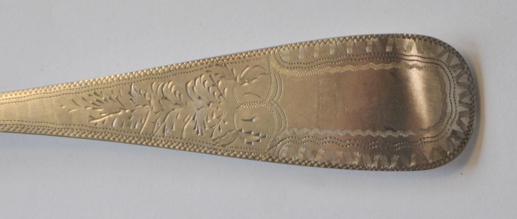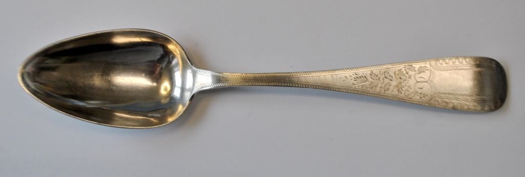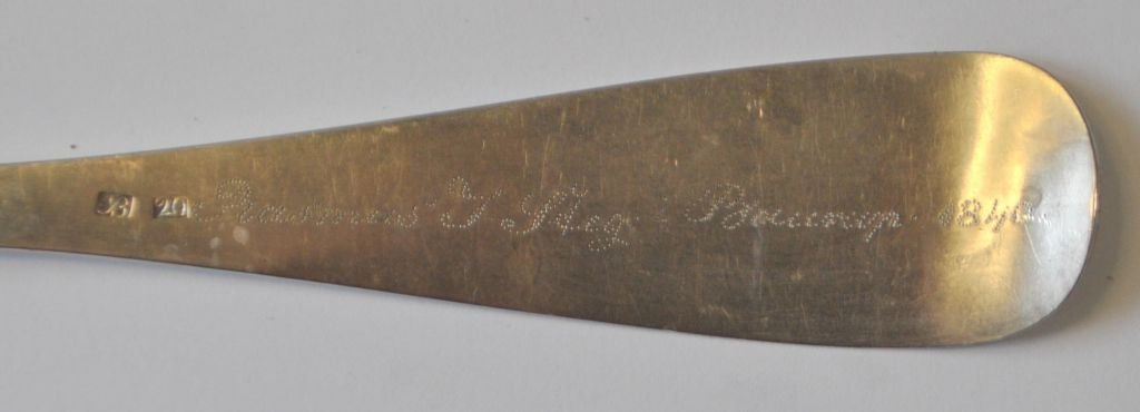 Empire sølvske, 1840. Sønderborg, Danmark. Mester: Georg Frederik Biehl (1785 - 1856). Stemplet. Med gravering. Verso indgravering: Rasmus J. Steg i Bourup. L .: 23,2 cm.