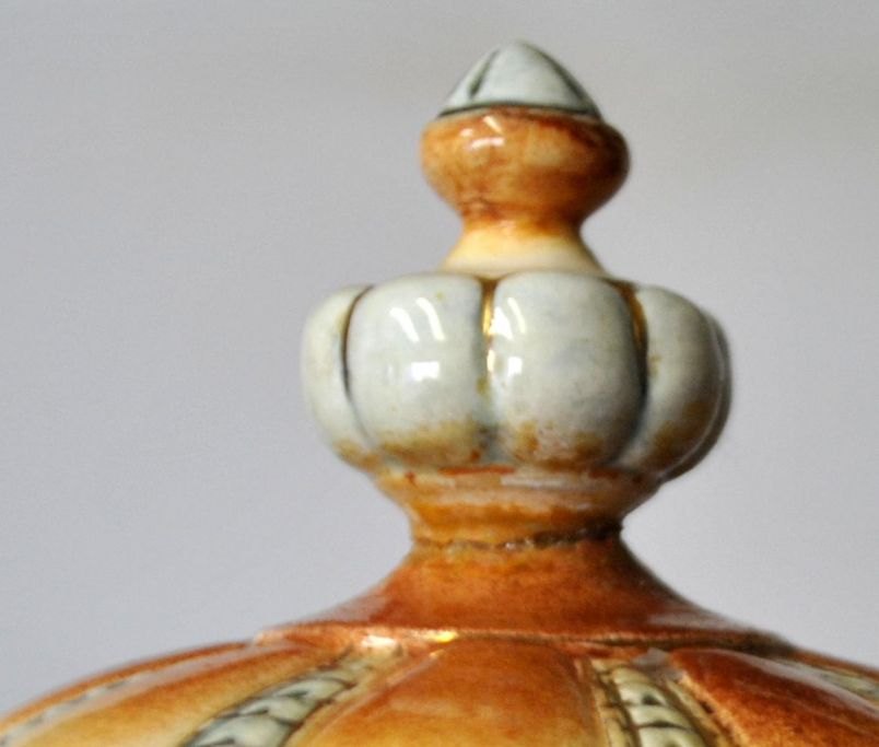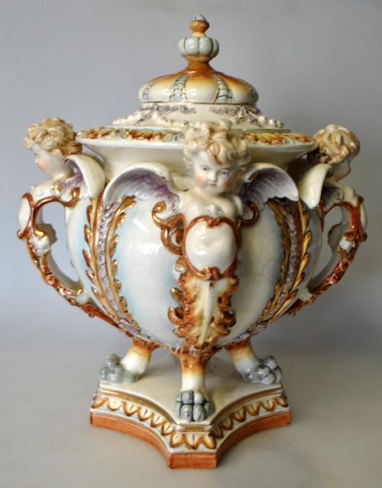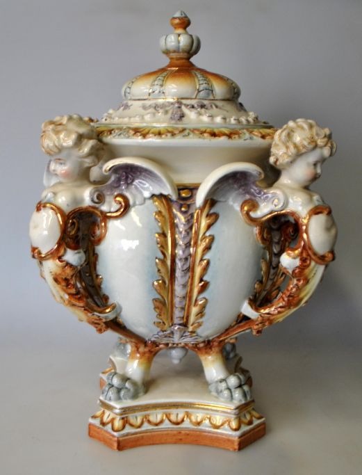 Tysk fajance låg krukke, Historisme, 19. årh. Krukke på fire løveben, 4 hanke i form af engle, Polykrom dekoreret og forgyldt. Stemplet. H.: 33 cm. Dia.: 26 cm.