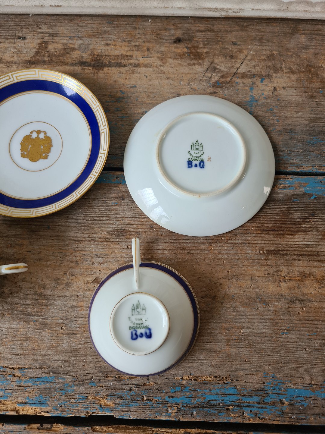 Set på 5 B&G små kaffekopper dekoreret med kongeblå fane, græsk evighedsmønster og våbenskjold i guld