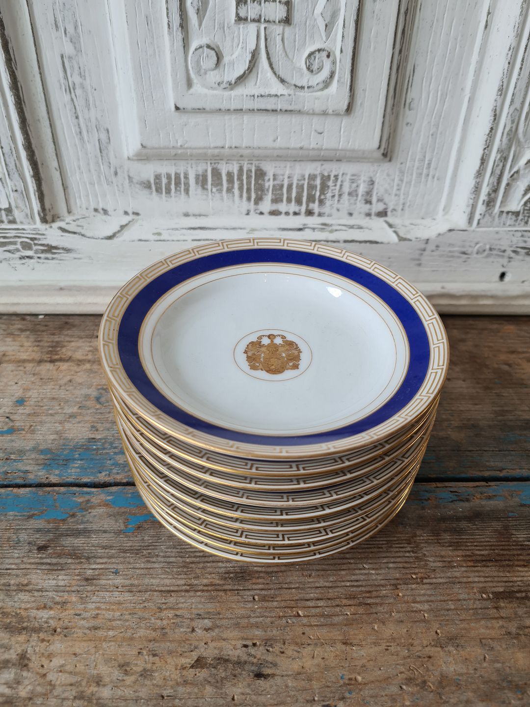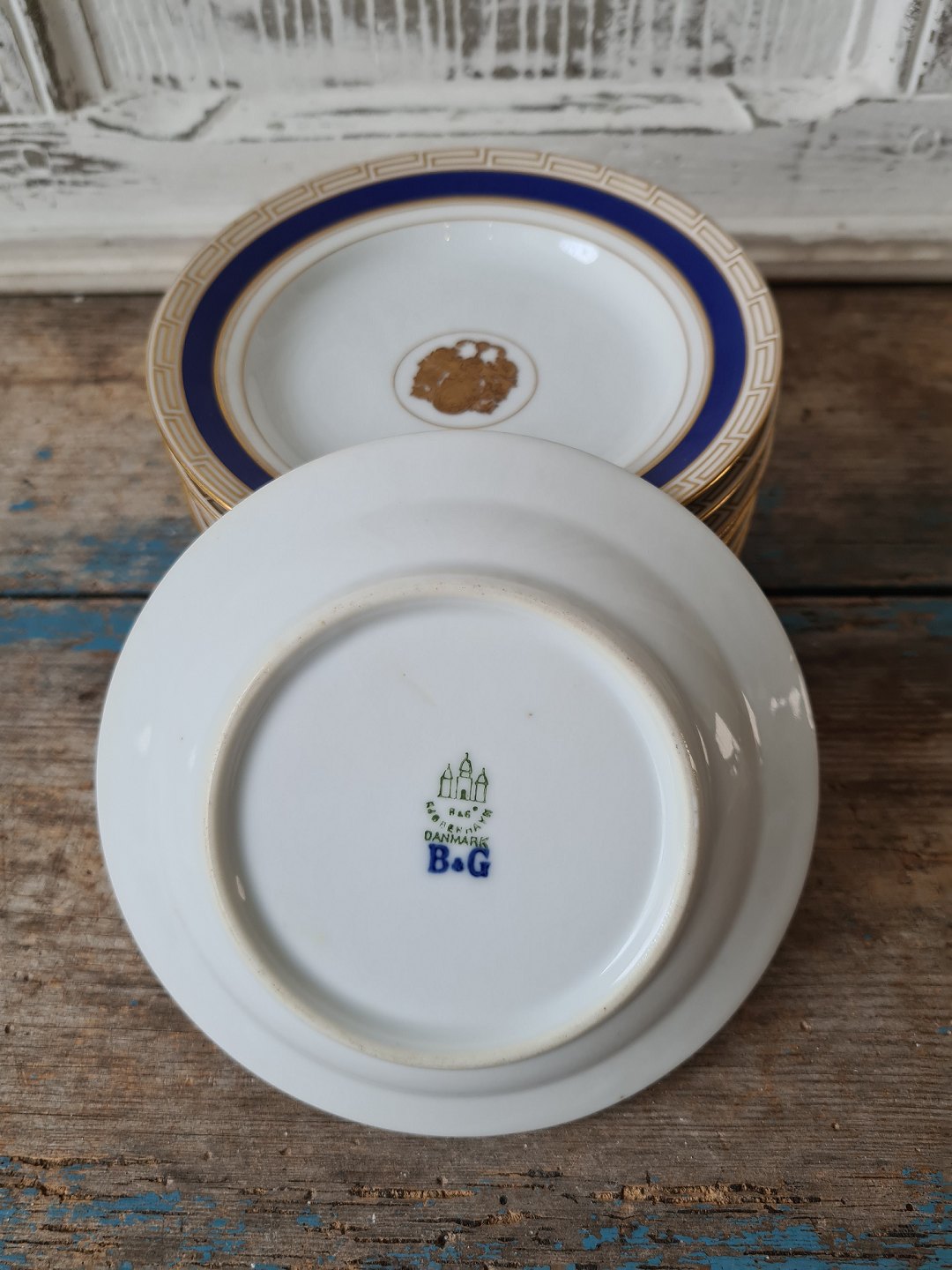 Sæt på 9 B&G kagetallerken dekoreret med kongeblå fane, græsk evighedsmønster og våbenskjold i guld.