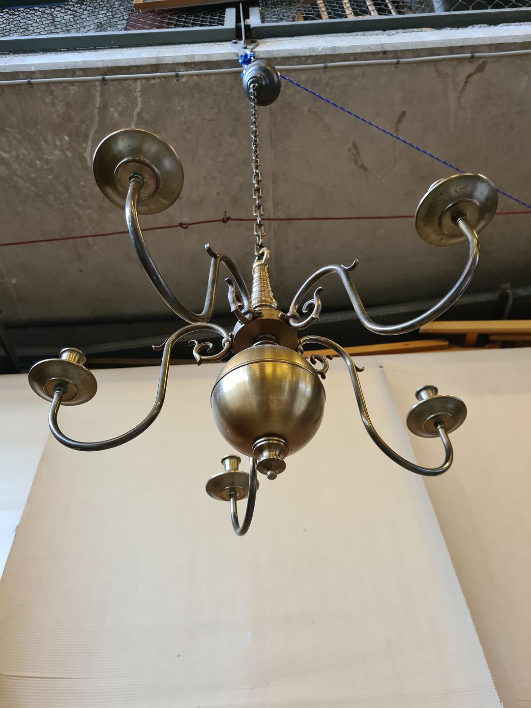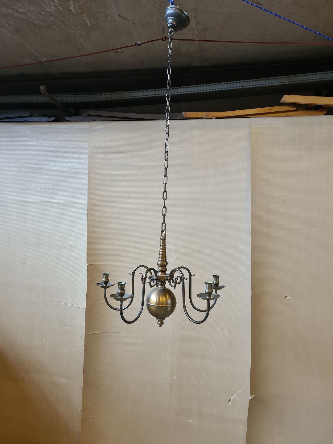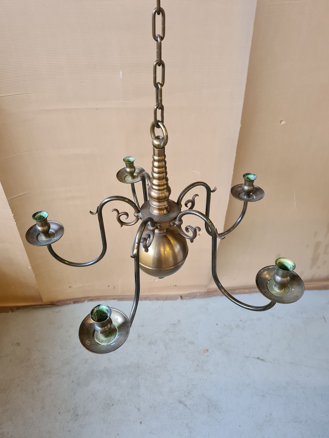 Kirkekrone med 6 arme til stearinlys i bruneret messing fra 1930erne.