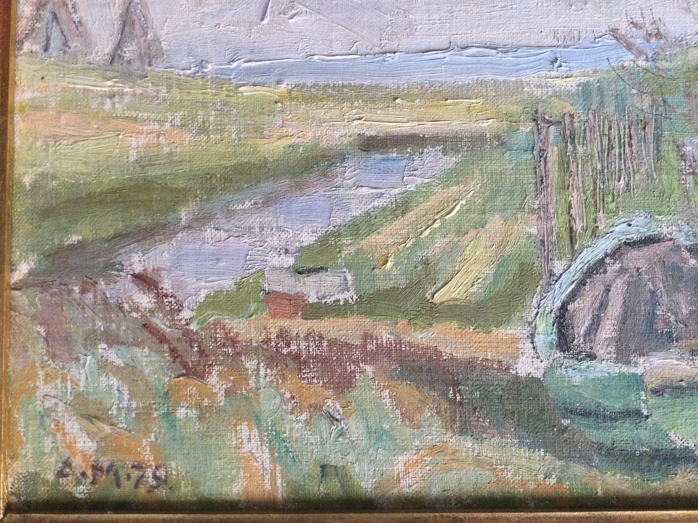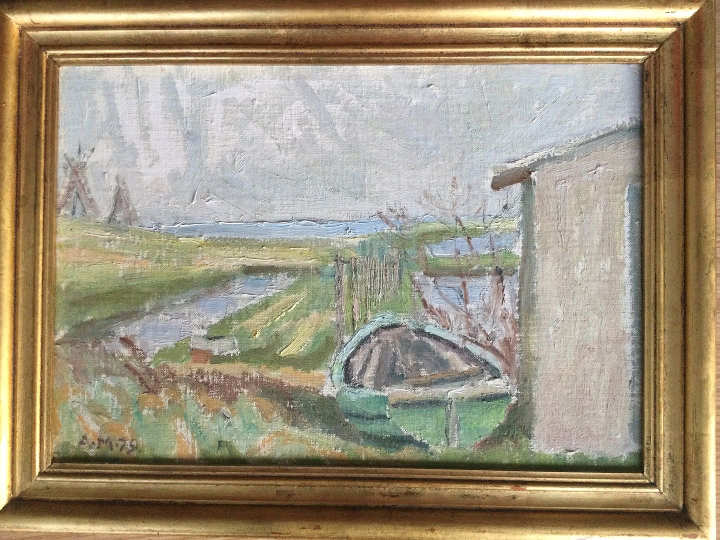Maleri af Aksel Møller - Båd og bådhus, Hvide Sande, Ringkøbing Fjord 1979.
