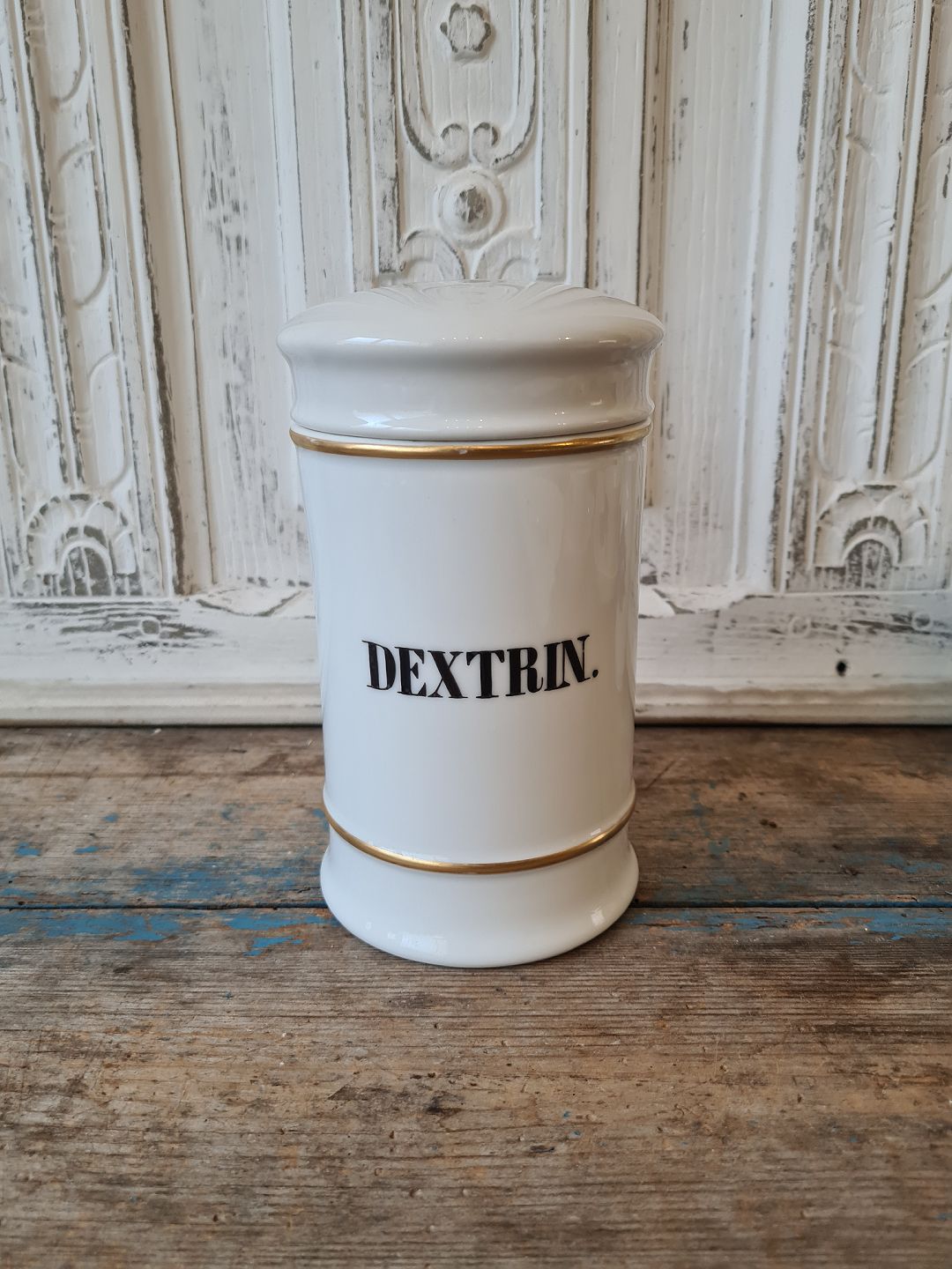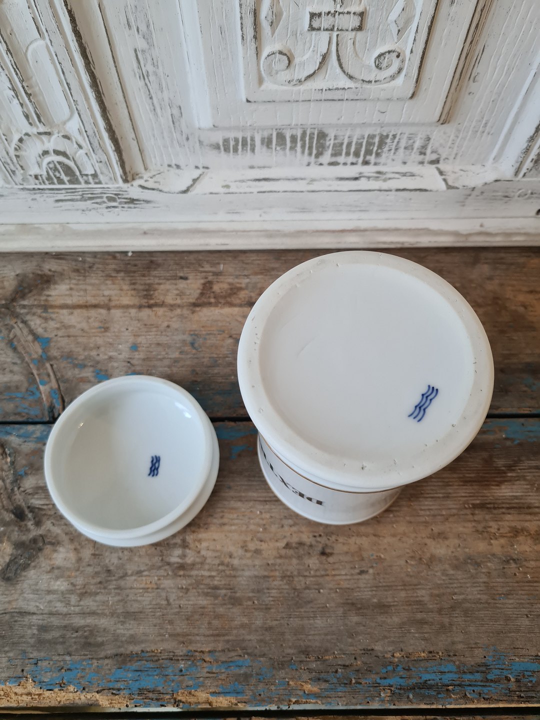Royal Copenhagen Apotekerkrukke i hvidt porcelæn med sort skrift og guld kant