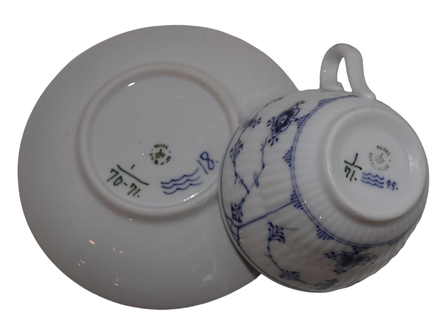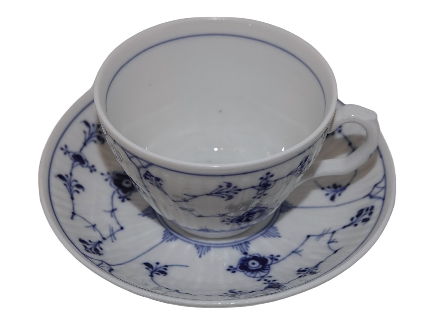 Royal Copenhagen Musselmalet Riflet, kaffekop med tilhørende kaffekop.