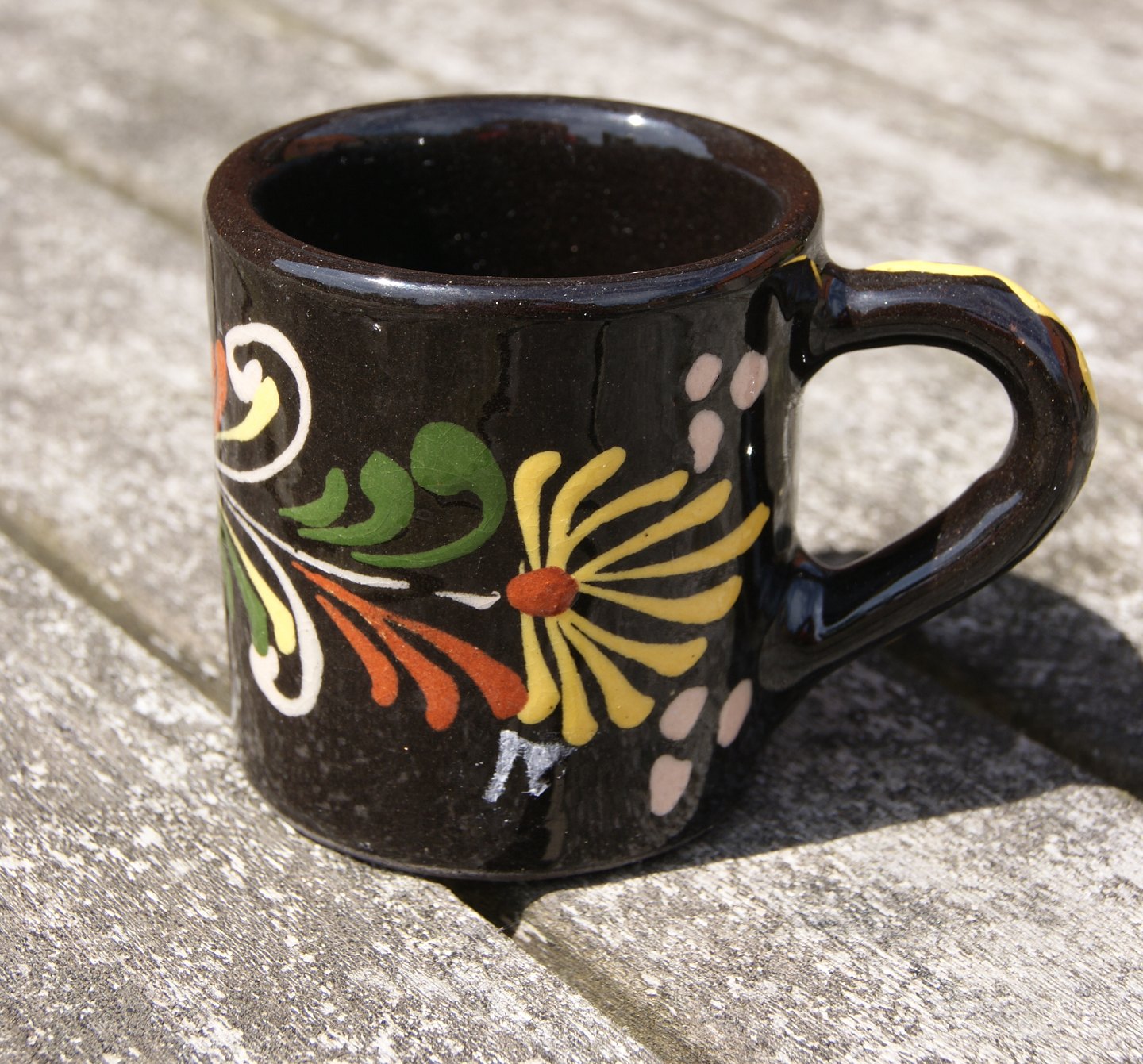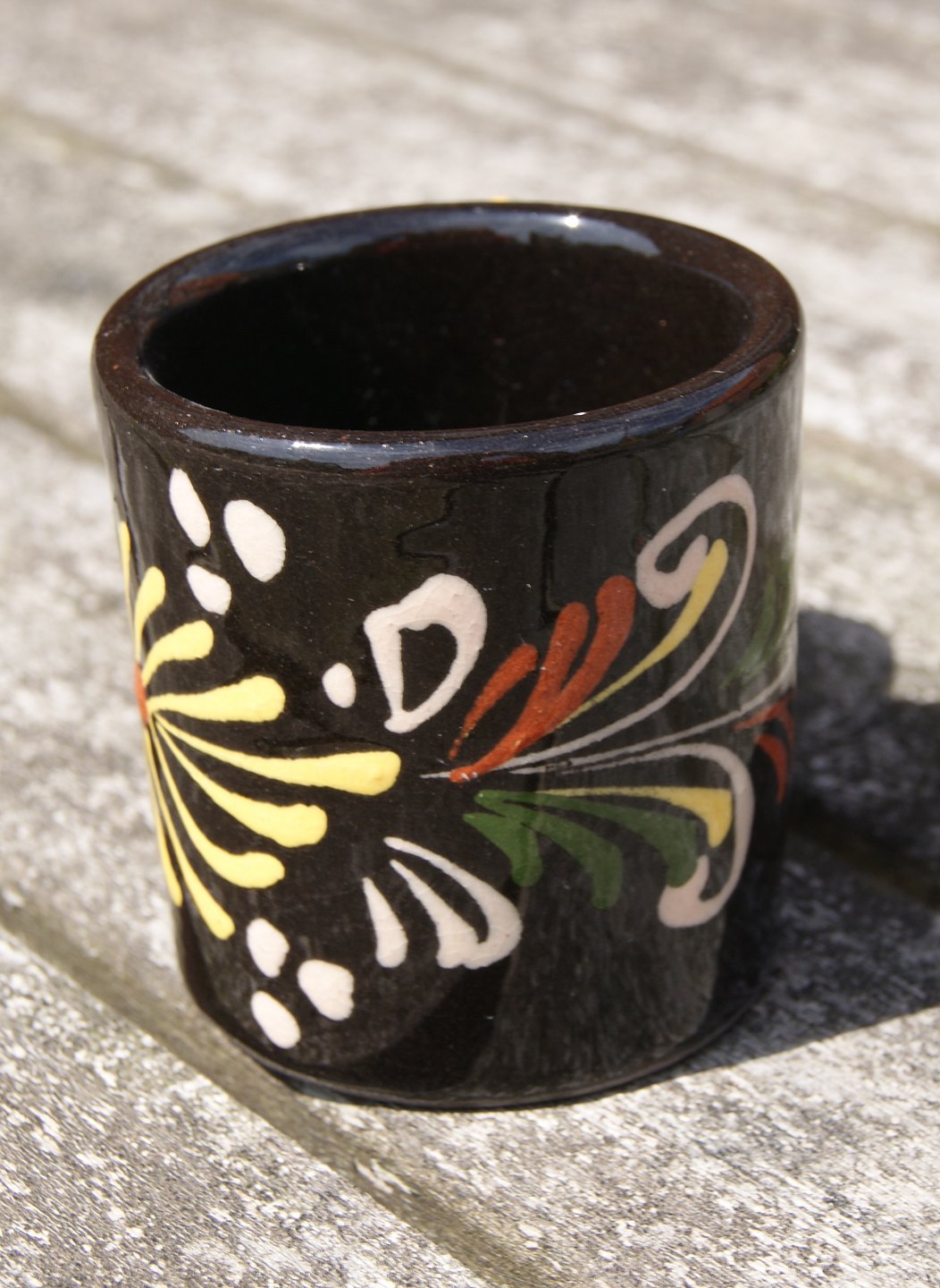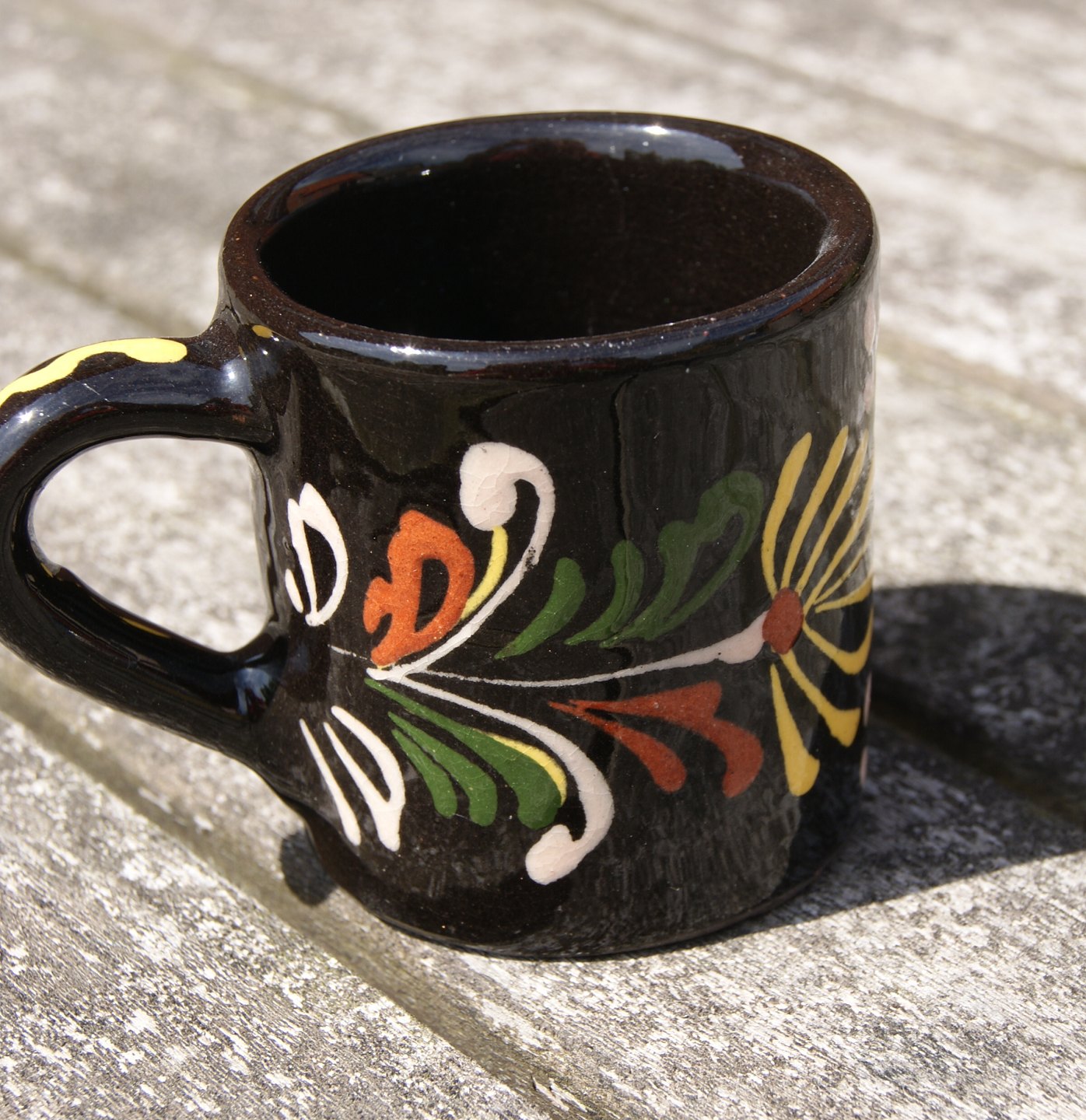 Svensk keramik, sæt på 4 små krus 6cm med sort glasur samt med dekoration
