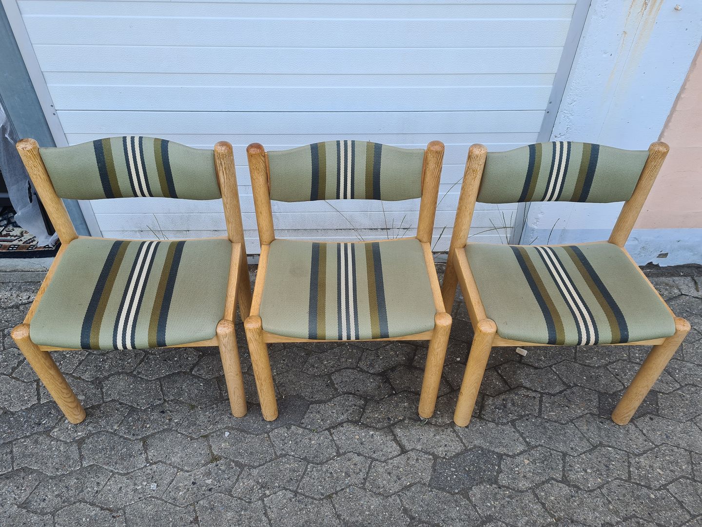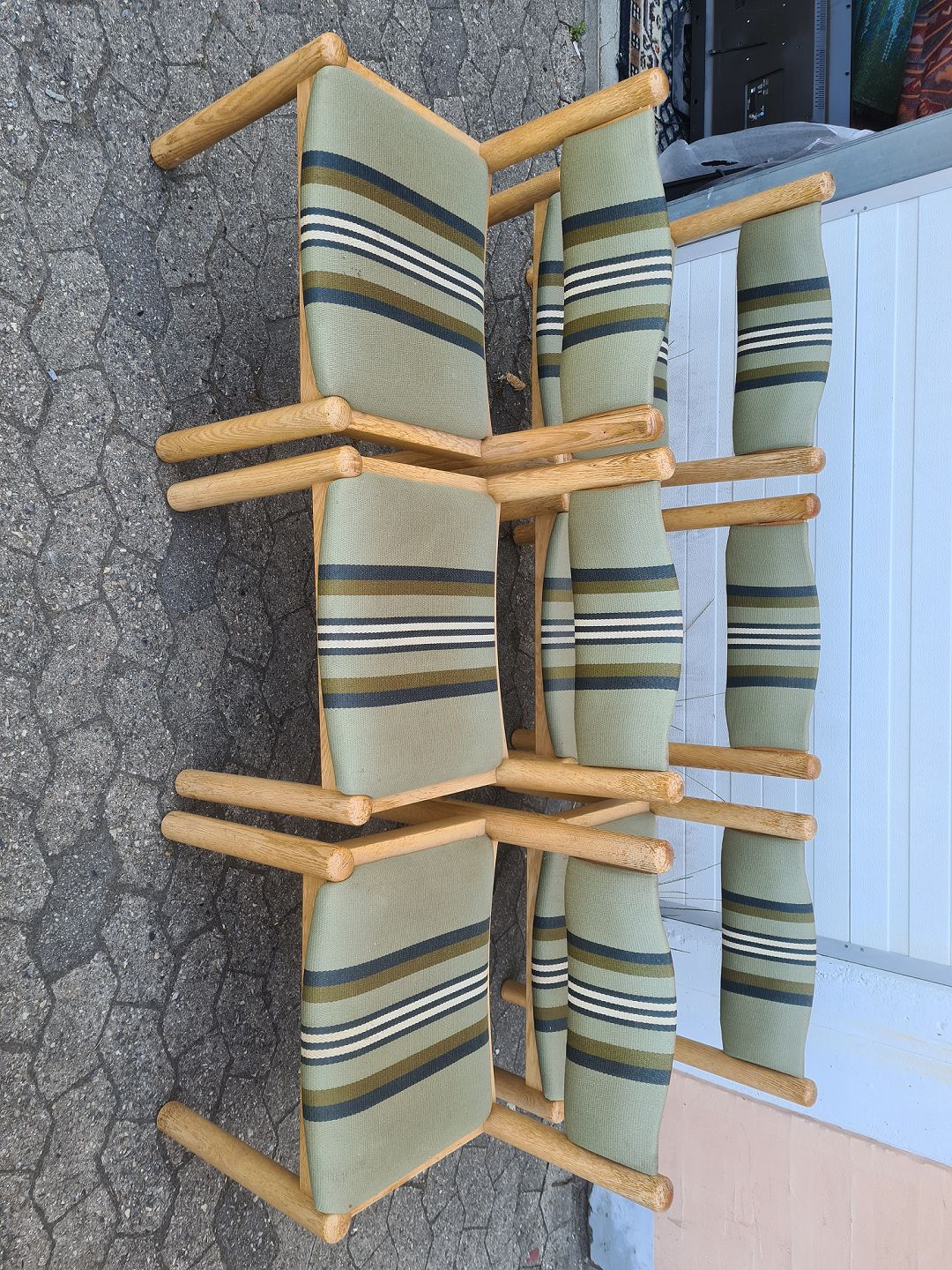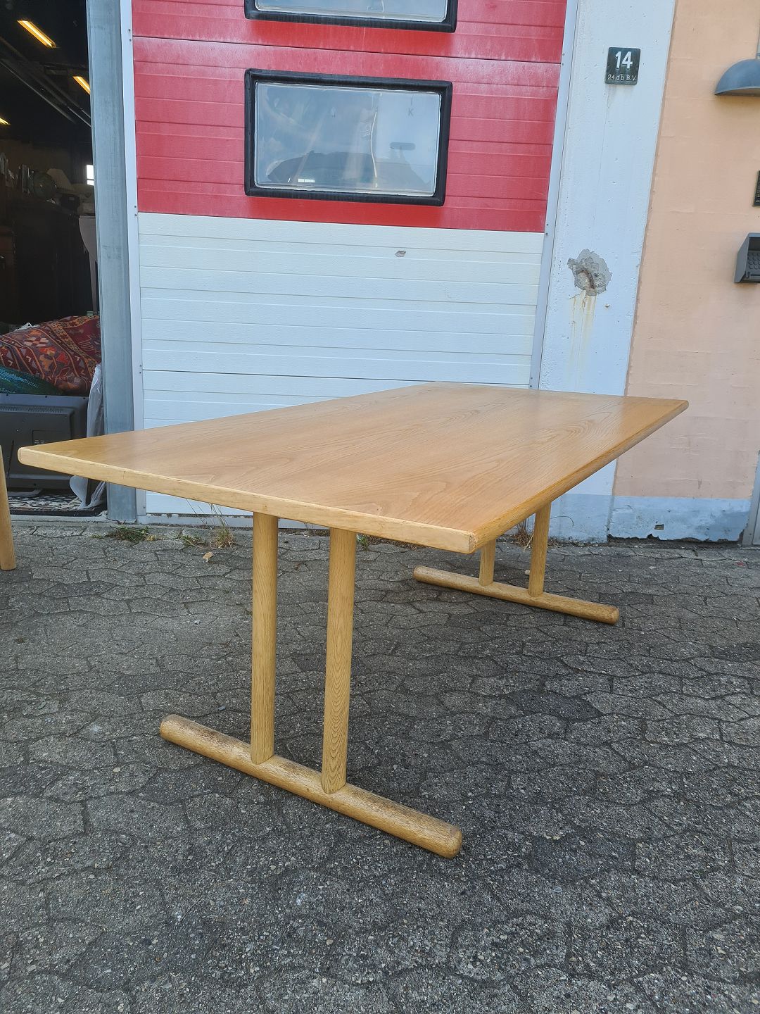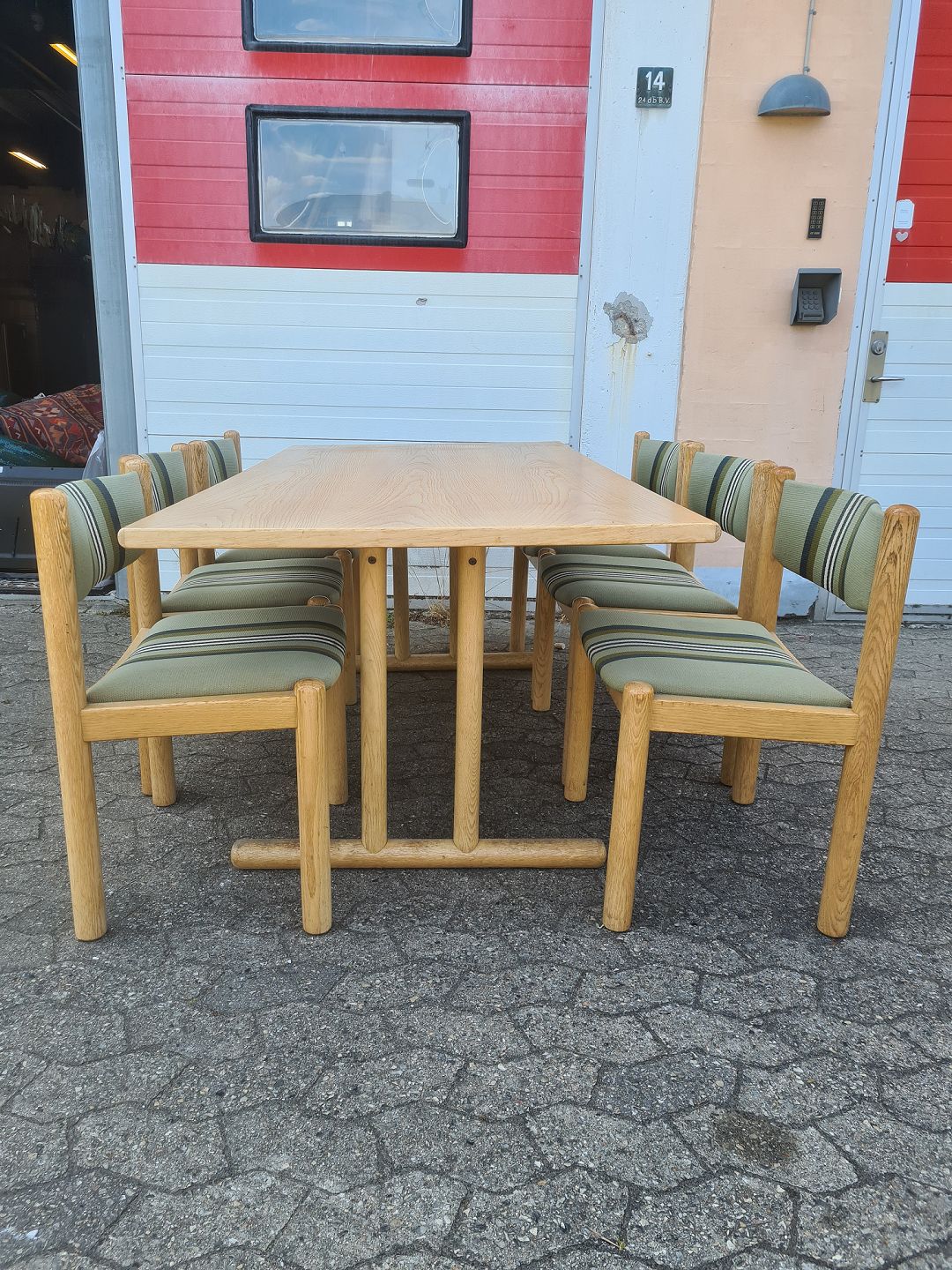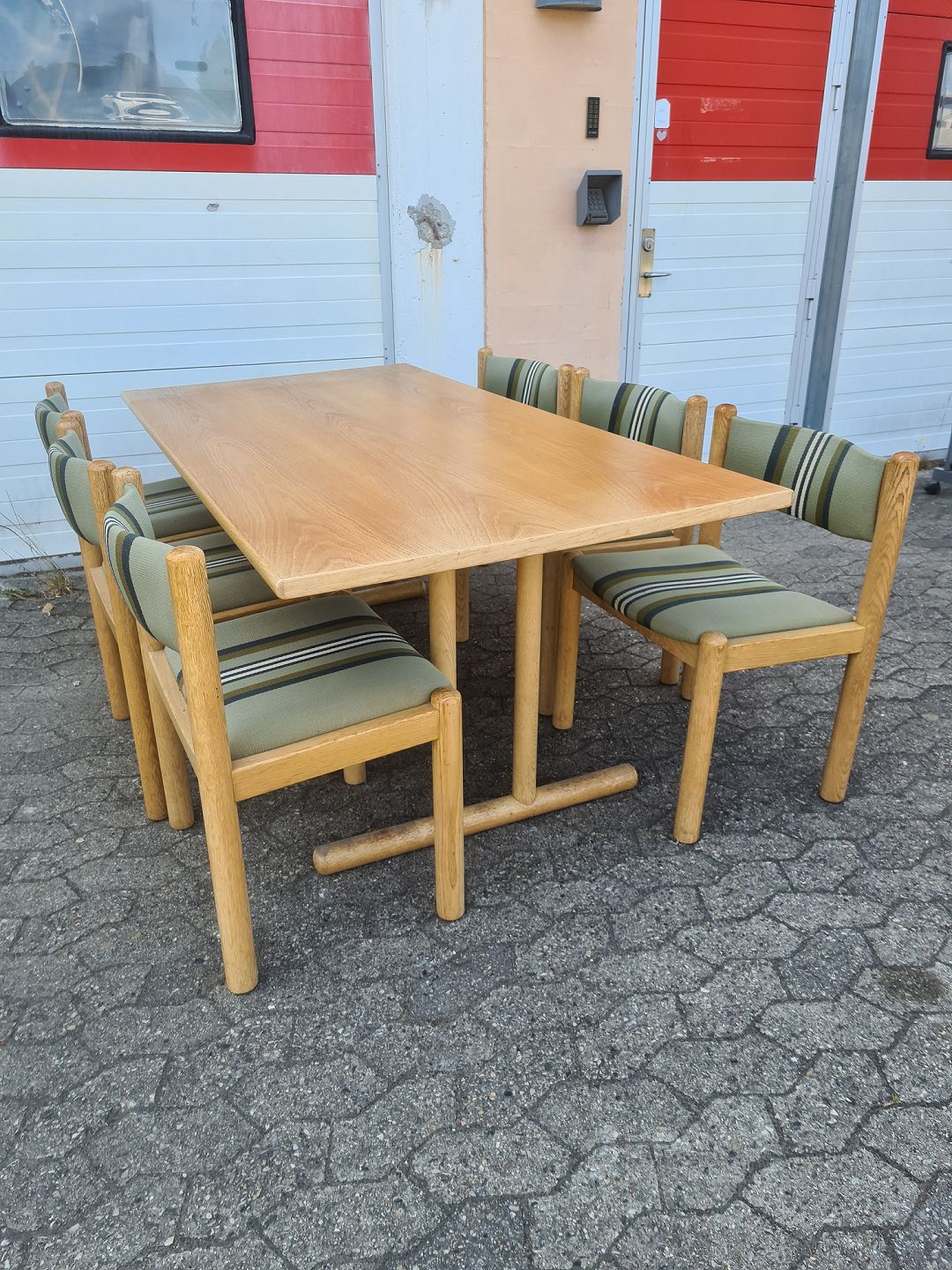 Bord i fineret egetræ med 6 stole, fra 1980erne.