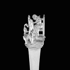 H.C. Andersen Eventyrbestik. 'Den grimme ælling/Spinderokken'. Børnebestik i sølv med motiv fra H.C. Andersens eventyr. L. 15 cm.