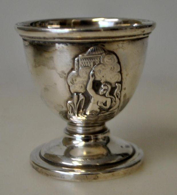 Æggebæger, sølv med dekoration i form af havfrue, Horsens Sølvvare Fabrik, 1938, Danmark. Stemplet. H.: 5 cm.Med navne indgravering på kumme.
