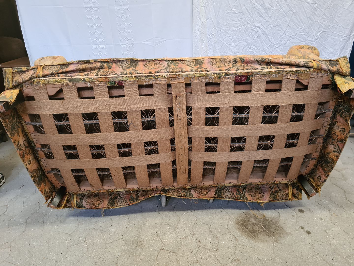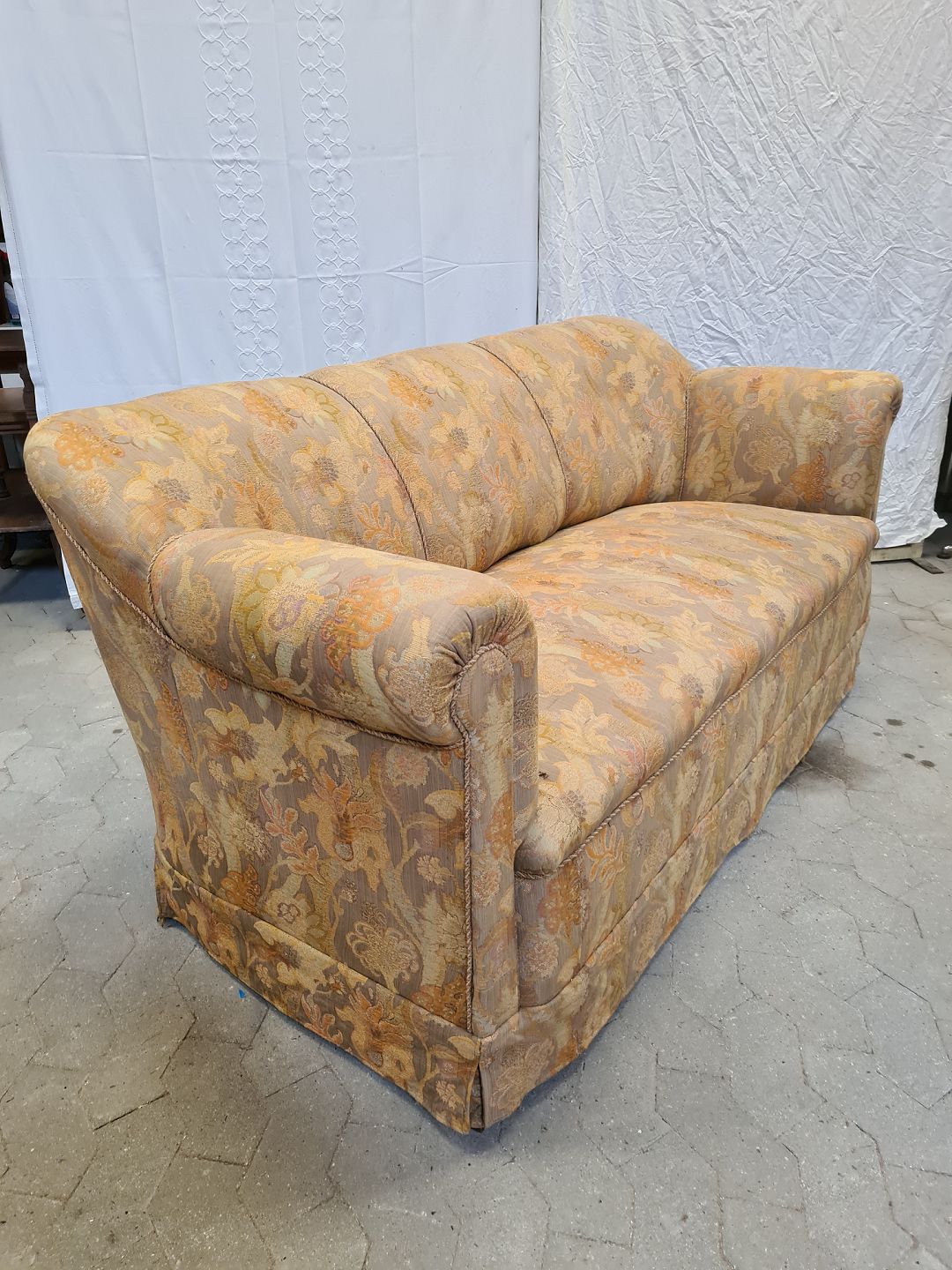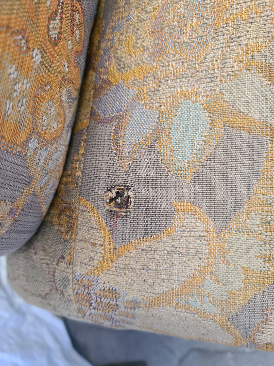 Den har brugsspor, et lille hul i betrækket og den er solbleget.