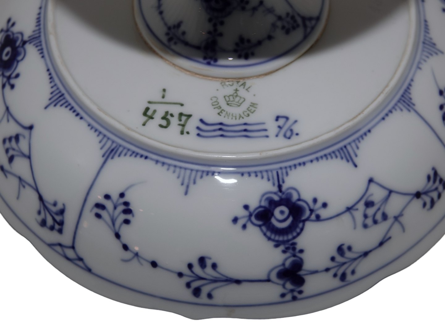 Royal Copenhagen Musselmalet Riflet, lille kageopsats på fod.