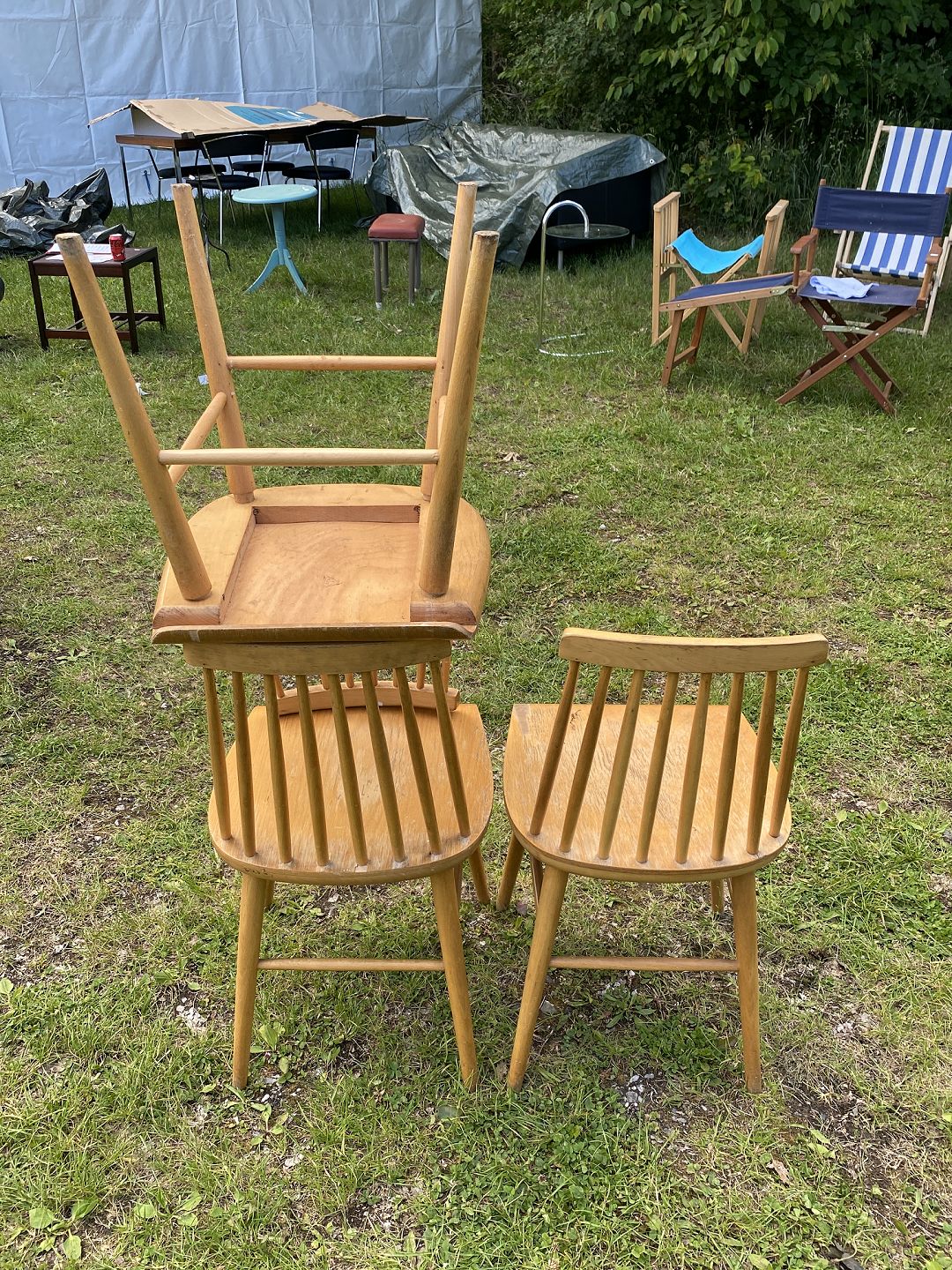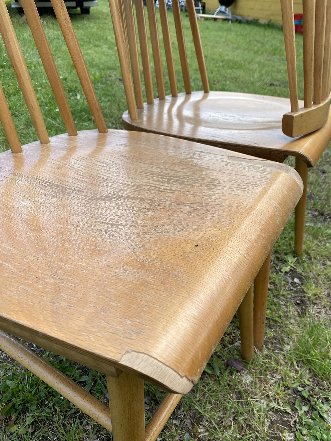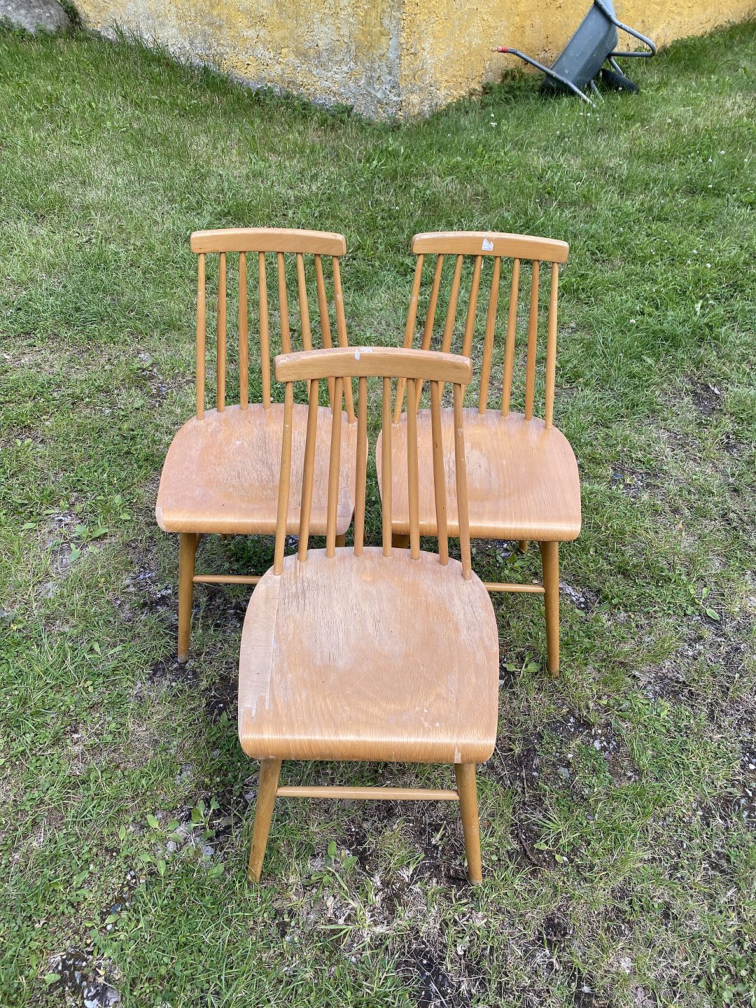 Tre pindestole i fineret Bøgetræ. Fremtår med brugsspor.