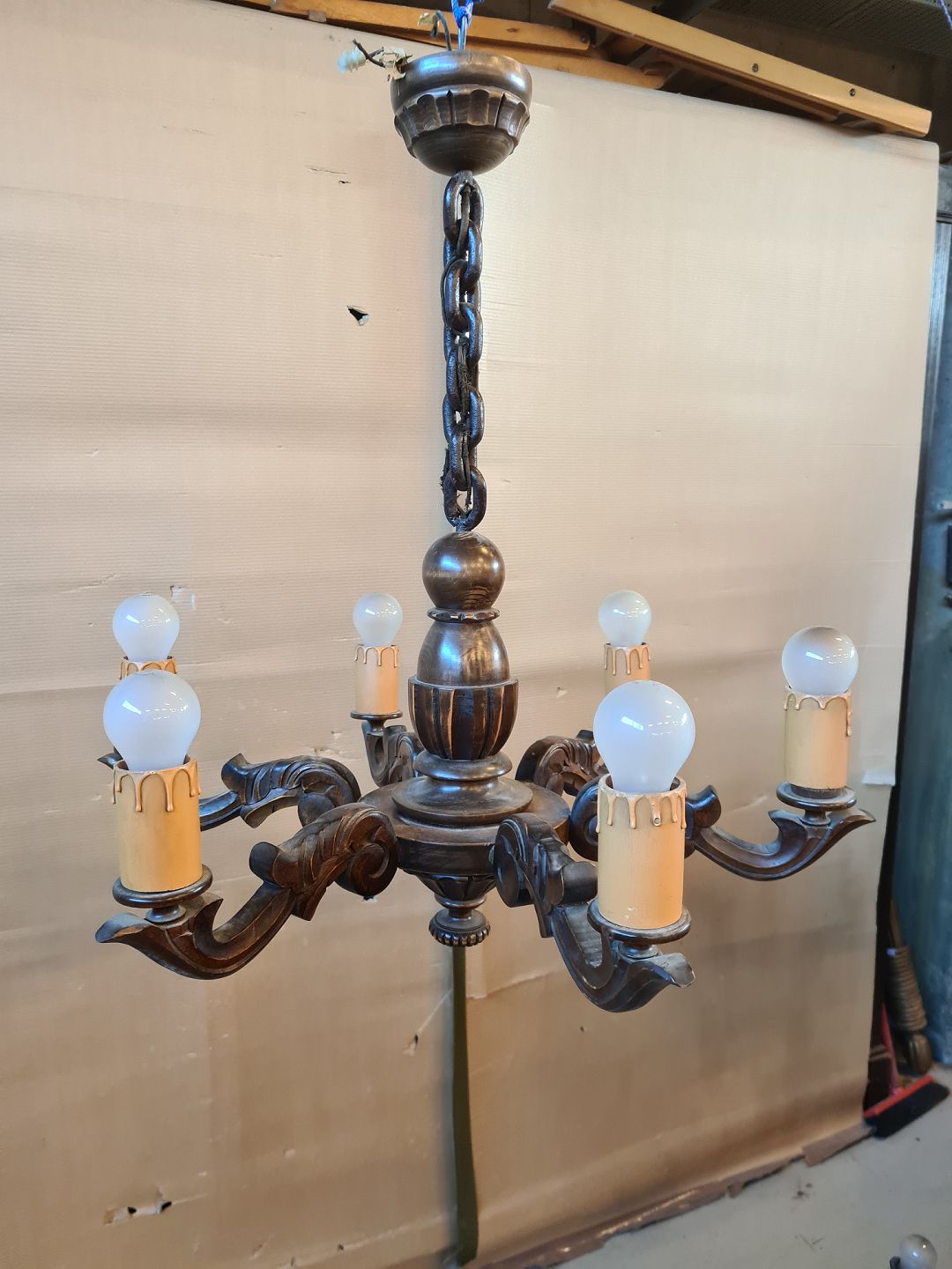 6-Armet lysekrone i massivt birketræ, fra 1930erne.