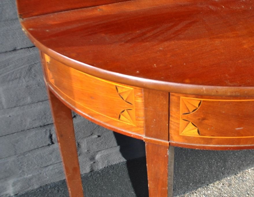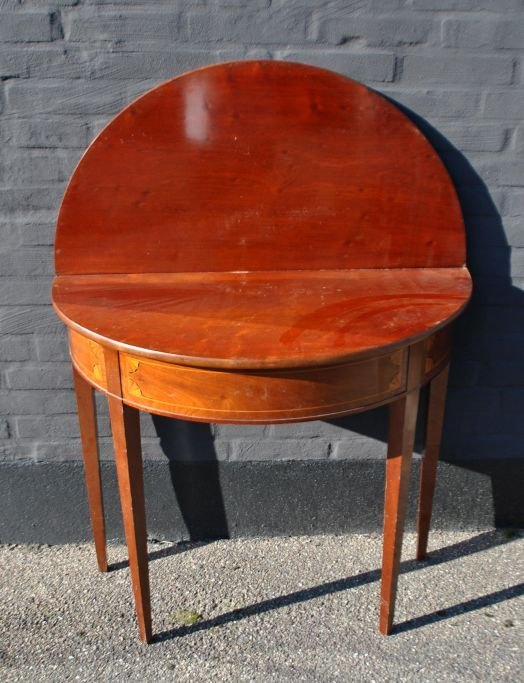 Dansk empire demi lune spillebord i mahogni med intarsia. ca. 1810. H.: 78 cm. D.: 44 cm. B.: 88 cm.  Urestaureret!