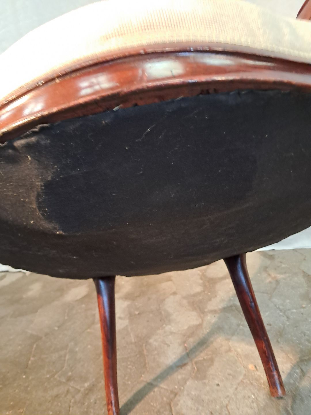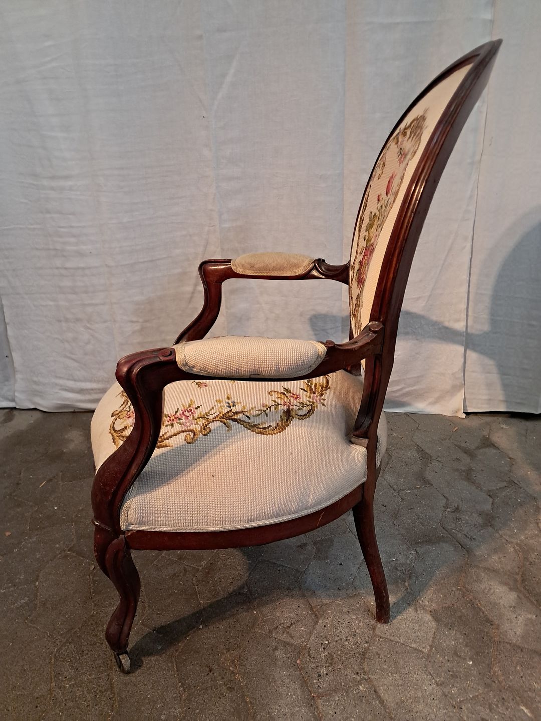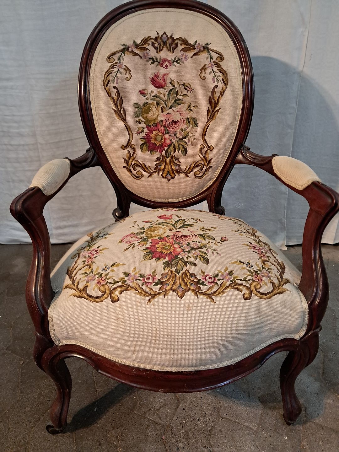 Armstol i massivt mahogni med broderet betræk, fra 1890erne.