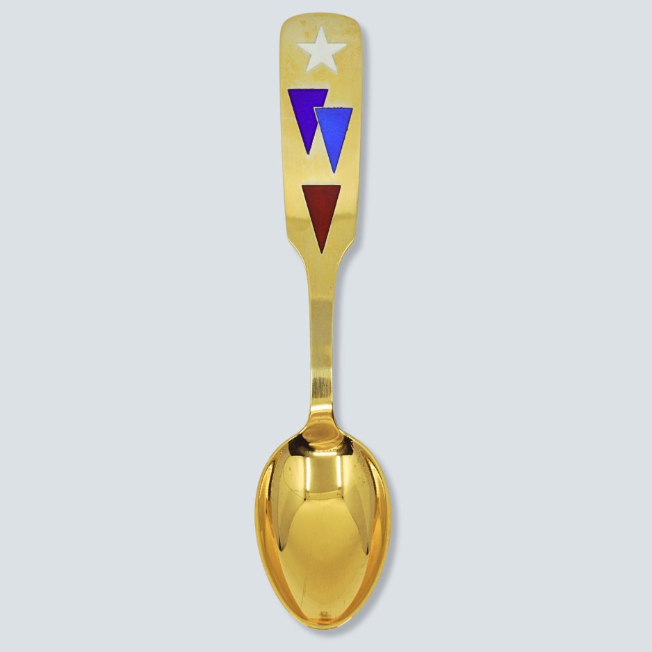 Søren Sass for A. Michelsen; Juleske 1954. Juleske af forgyldt sterling sølv med emalje. Designet af Søren Sass.