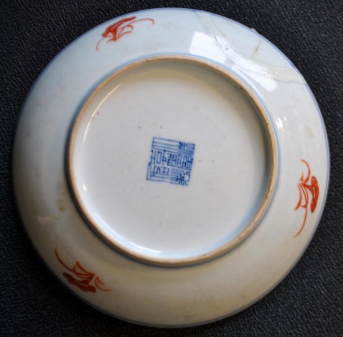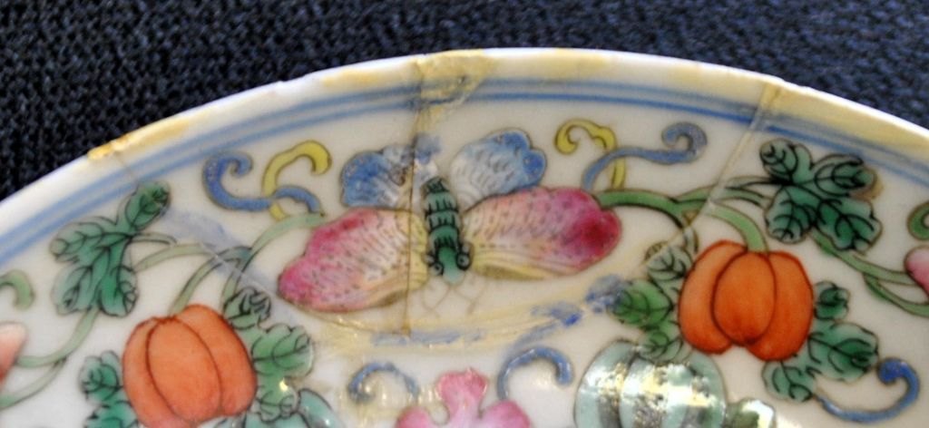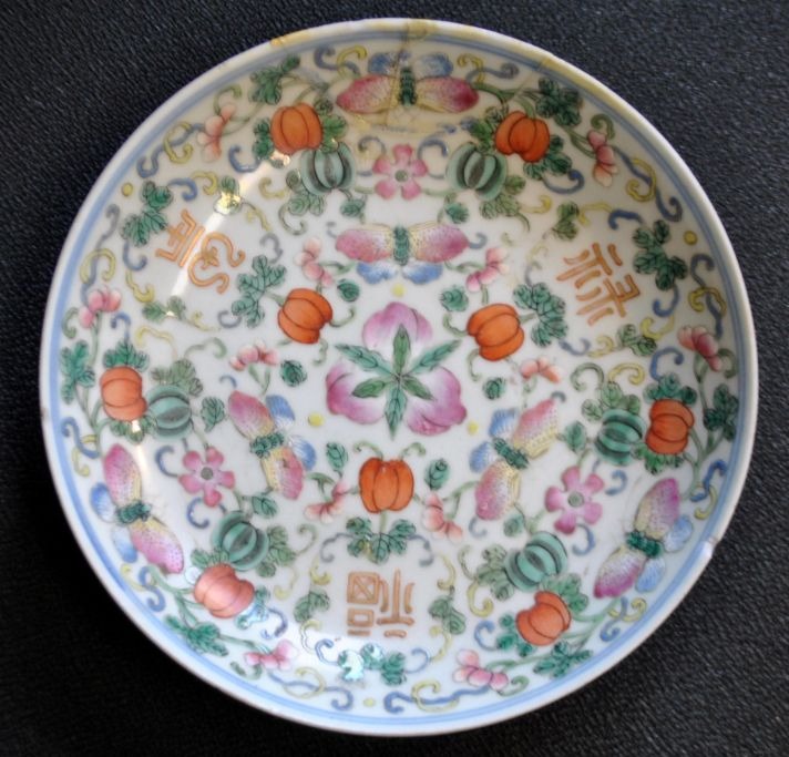 Kinesisk porcelains tallerken, polykron dekoreret, 19. årh. Motiv med sommerfugle, blomster og skrifttegn. Signeret. Dia: 15 cm.