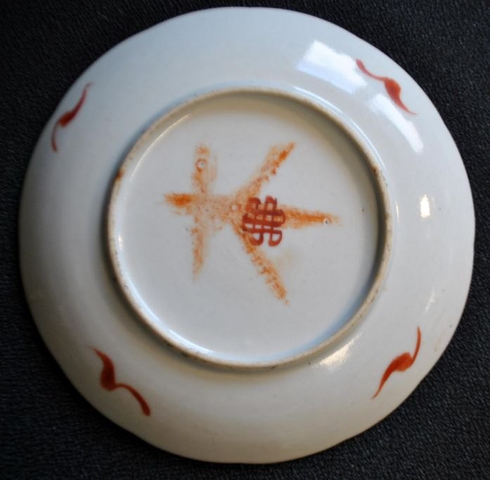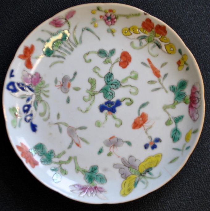 Kinesisk porcelains tallerken, polykron dekoreret, 19. årh. Motiv med sommerfugle og blomster. Signeret. Dia: 16 cm.