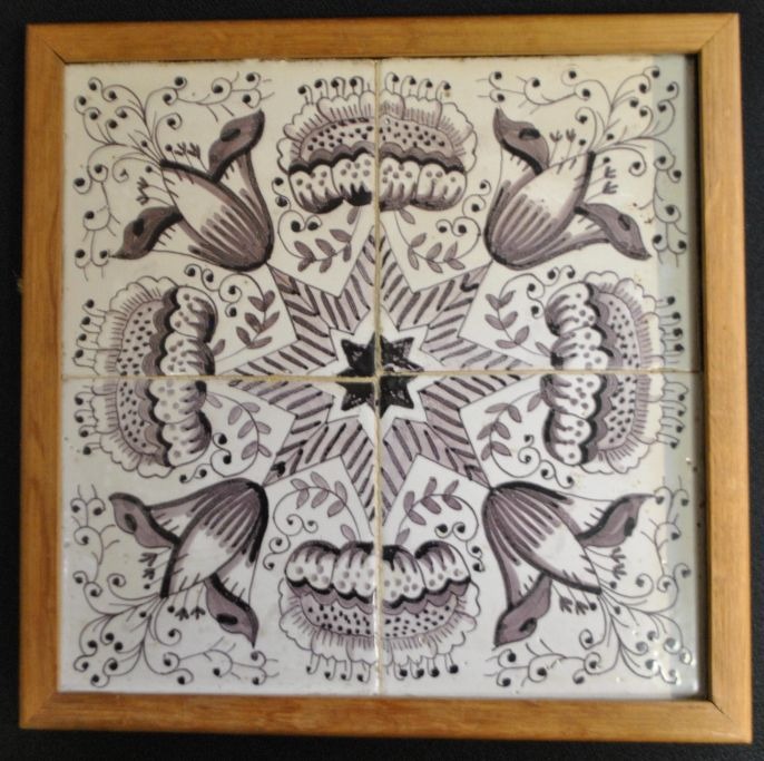 Firpas med hollandske fliser, midterste del af 1700-tallet. Ornament flise. Mangan farvet.  12,8 x 12,8 cm.