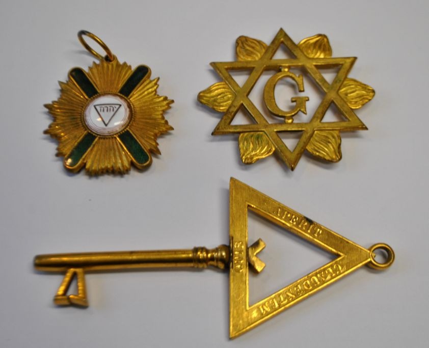Lot frimurer tegn, 20. årh. 3 stk. Forgyldt messing/bronce. Bl.a. fra Frankrig, Scotland og Sverige.