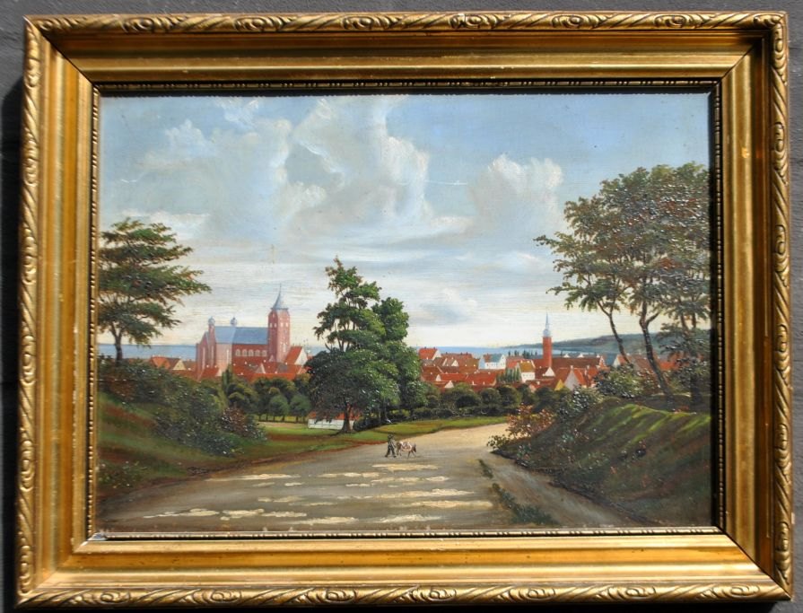 Holm, Peter (1798 - 1875) Danmark: Aarhus set mod syd med Domkirken og Klosterkirken. Olie på metalplade. Usigneret. 25 x 35 cm.