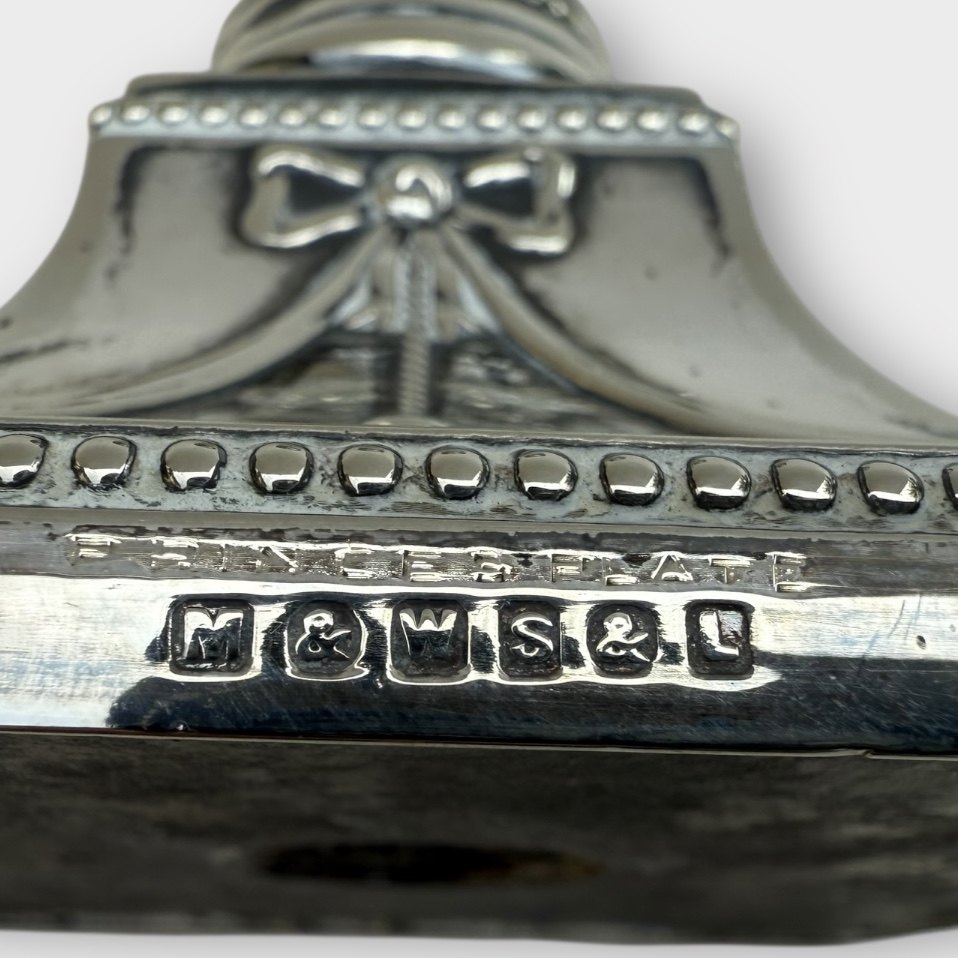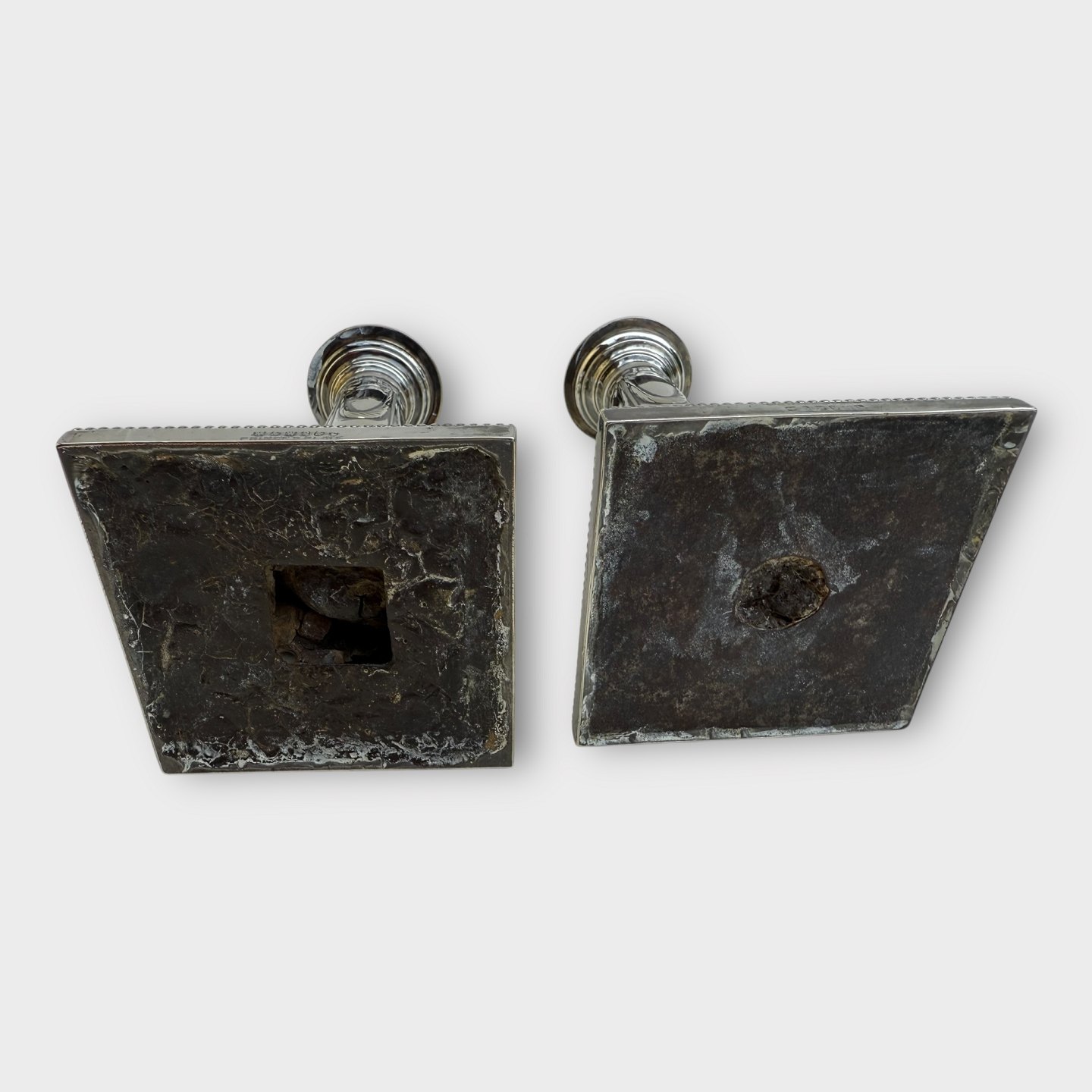 Et sæt engelske sølvplet lysestager, udfyldte i bunde og med løse lys manchetter, fod 8x8 cm, Højde 14 cm